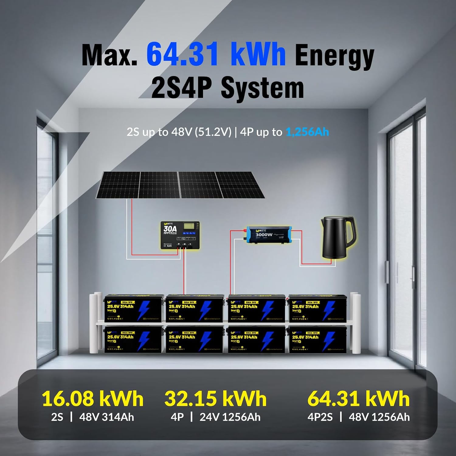 - 【Flexible Expansion】 The WattCycle 24V 314Ah lithium battery delivers 8038Wh of energy and supports up to 4p2s, providing 1256Ah at 48V — an excellent choice for RVs, offering long-lasting power for your journeys. It also supports up to 2 in series, making it ideal for 48V solar power systems