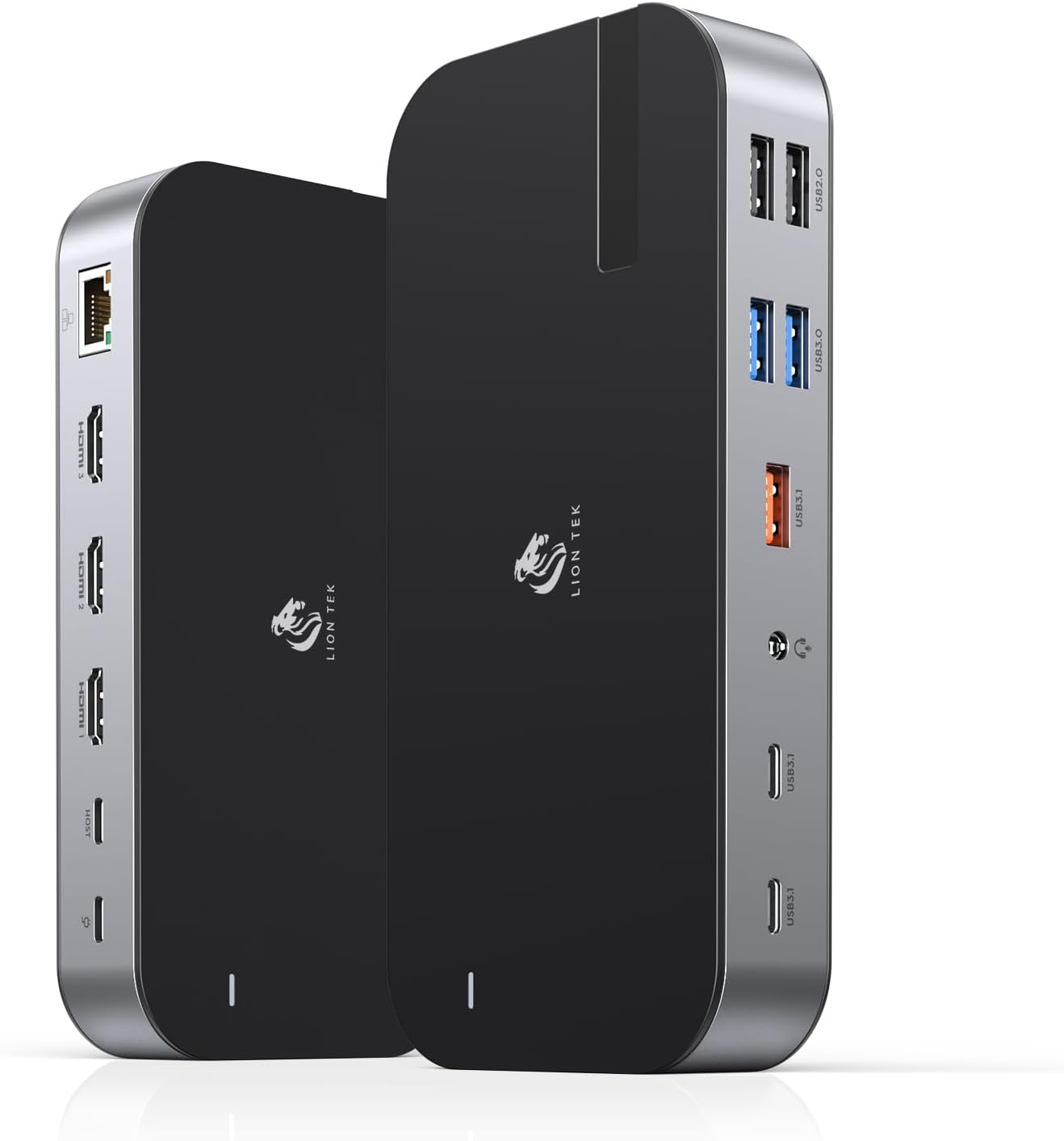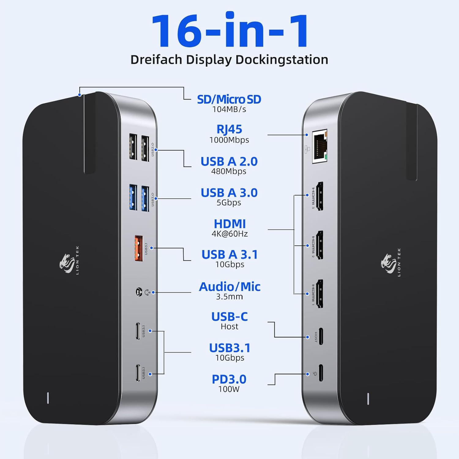 - 【16 in 1 USB C Docking Station】USB C Docking Station 3 monitor with a PD100W port (charging only), Gigabit RJ45 port, 3* 4K HDMI ports, SD and TF card slot, 3 * USB 3. 1 ports, 2* USB 3. 0 ports and 2* USB 2.0 ports, 3.5mm audio port equipped. With a simple plug-and-play connection, the USB C hub turns any Windows system laptop into a mobile workstation. Meet all your needs with a versatile 16 in 1 Laptop Docking Station