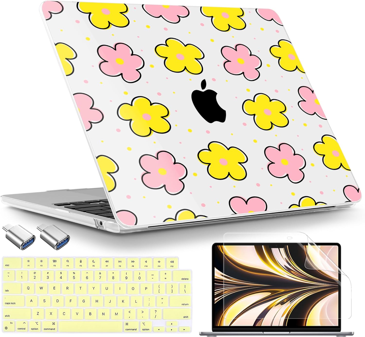 TWOLSKOO Compatible with M4 MacBook Air 13.6 inch Case 2025-2022 Release M4 A3240 M3 A3113 M2 A2681, Plastic Hard Shell & Keyboard Cover & Type C Adapter & Screen Protector, Cute Flowers