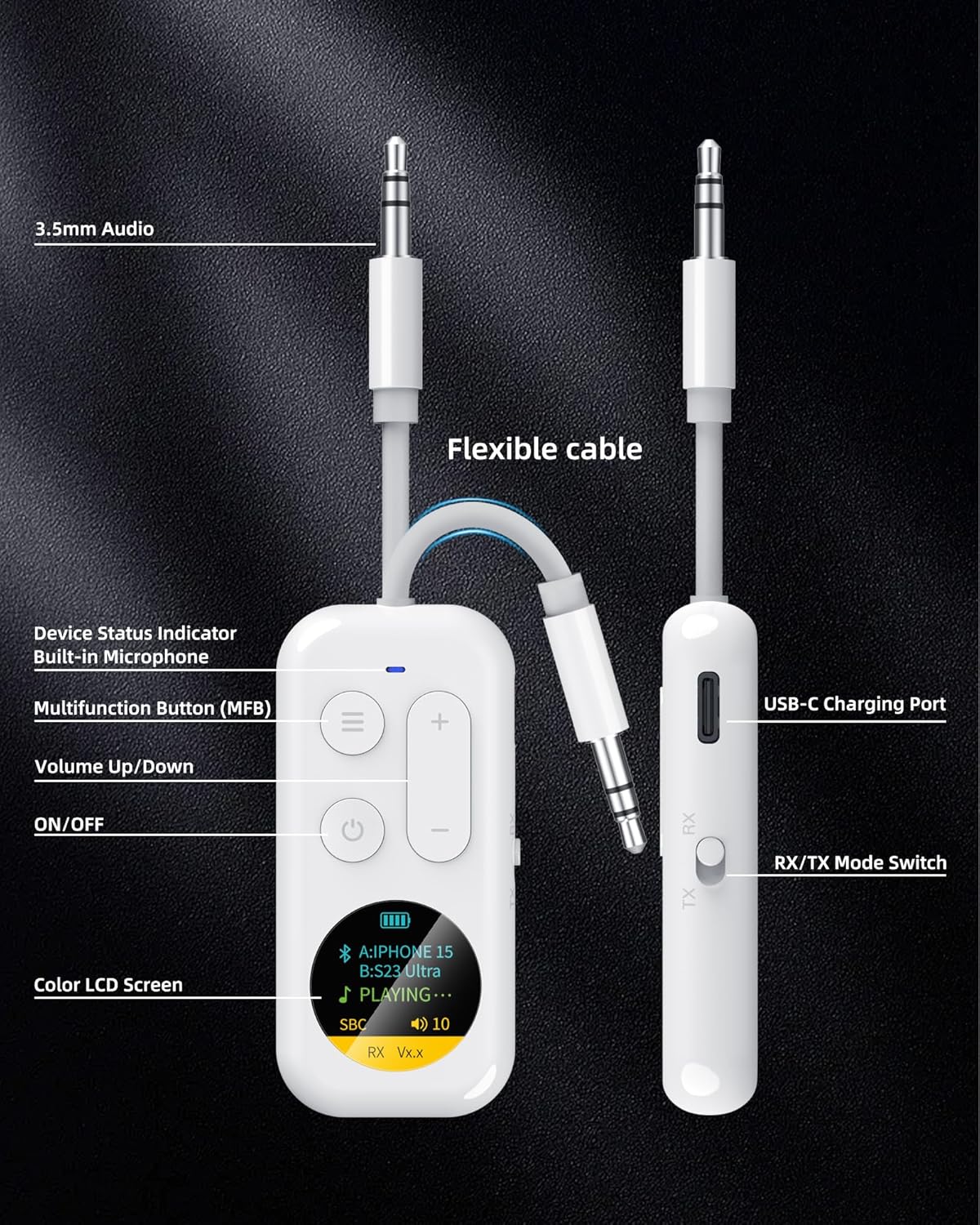 - Dual Mode Functionality: Experience seamless switching between TX (transmitter) and RX (receiver) modes. Use this bluetooth audio adapter as a transmitter with 3.5mm audio output devices like TVs and game consoles, or as a receiver for your car stereo and wired headphones, providing versatile 3.5mm to wireless solutions for any environment.