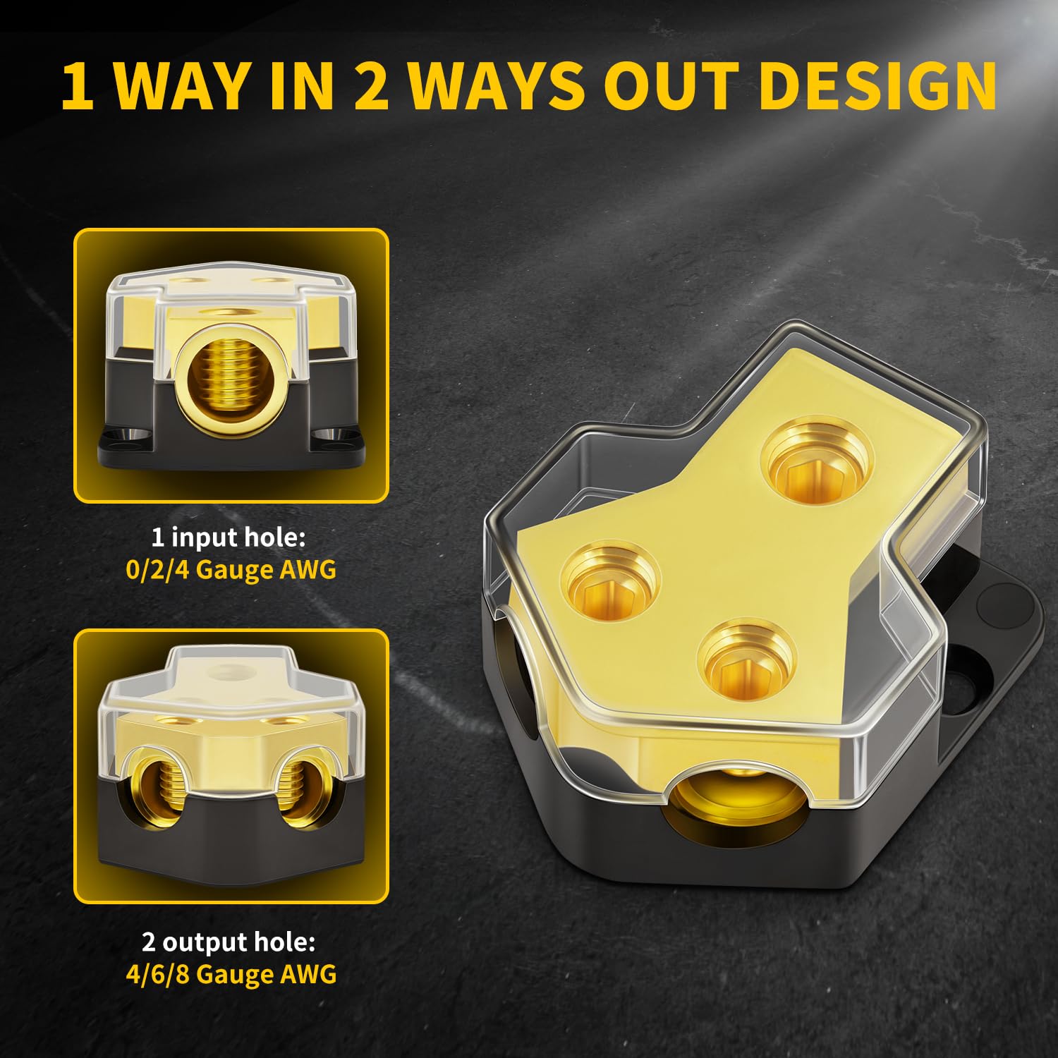 - 【Specification】: 2-Way 12v power splitter block, 1 x Input hole, 2 x Output hole, 0/2/4 Gauge AWG In, 4/6/8 Gauge AWG Out. Widely used in Audio System, suitable for Automotive, Car, Truck, Marine, Boat, etc.
