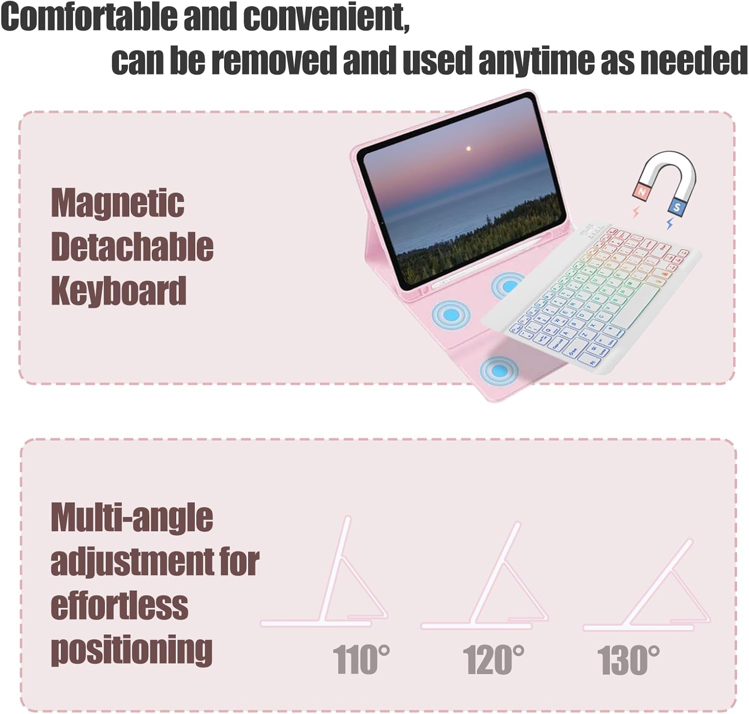 - 【Multi-Angle Viewing, Foldable Case】 Built-in anti-slip grooves support three tilt angles: 100°, 110°, and 120°. Securely holds your tablet at any angle with strong support. Folds like a book to free your hands for typing, reading, or viewing. Effortlessly handles learning, work, writing, reading, or watching videos.