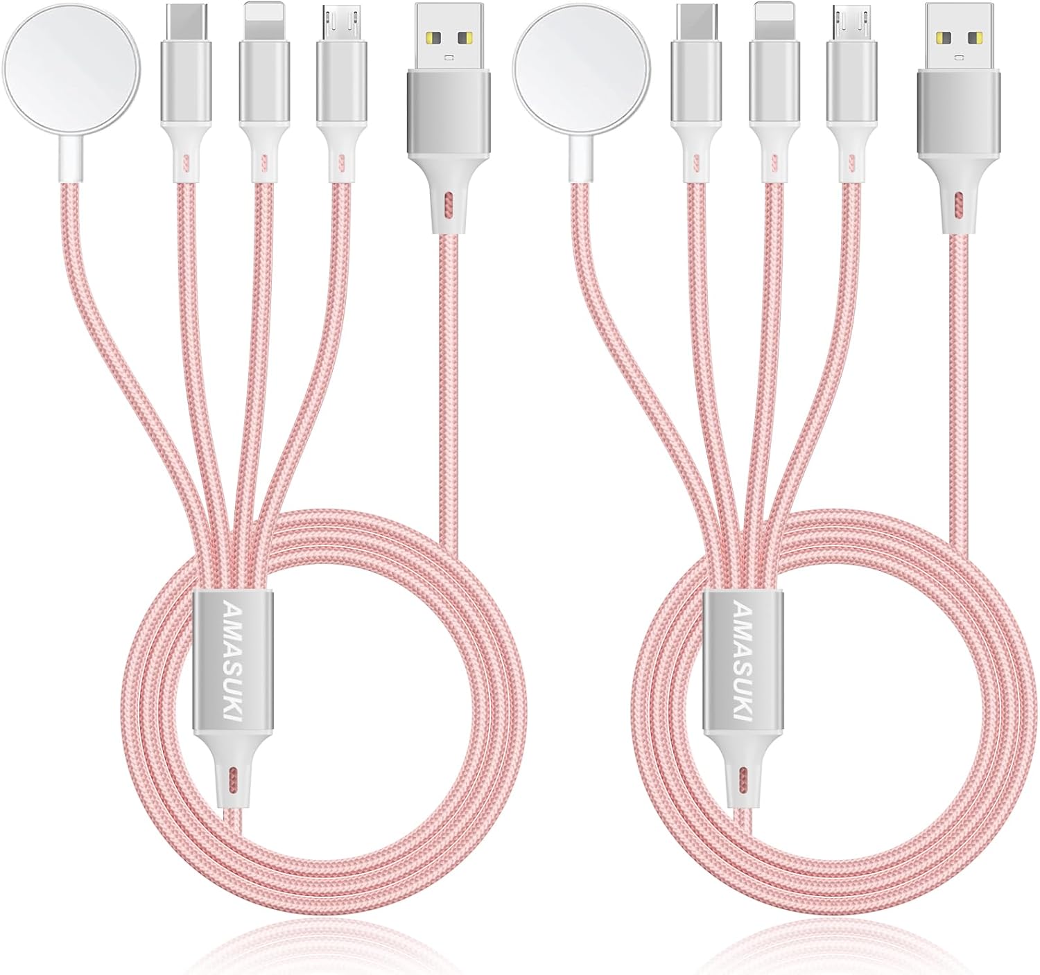 2Pack Travel Essentials Multi Charging Cable for Watch Charger 4 in 1 Fast Charger Camping Essentials USB C/L/Micro Compatible with Watch Series 10-1/SE/Ultra Phone 16 15/Galaxy Android-4FT/Pink