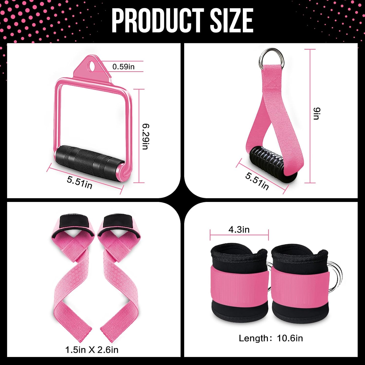 - 💪【Lat Pulldown Attachments Set】: Includes:1x Lat Pull Down Bar, 1x Tricep Rope, 1x Double D Handle, 1x V-Shaped Bar, 1x Straight Rotating Bar, 2x Single D Handle, 2x Cable Machine Handle, 2x Ankle Straps,2 x Lifting Wrist Straps and 8 x Snap Hooks . These home gym accessories for men and women are designed to fit most cable systems.