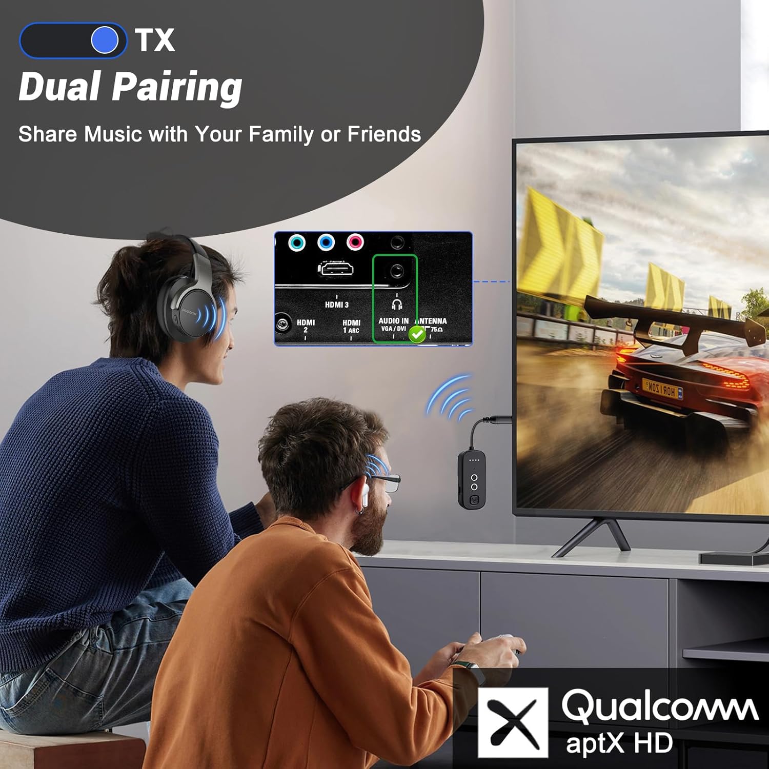 Bluetooth Transmitter Receiver with Airplane Adapter: Wireless Audio Transmitter for 2 AirPods/Headphones - 20+ Hr Battery Works USB Charging with 3.5mm Jack AUX for Flight,Gym,Car,TV,Tablet,Travel