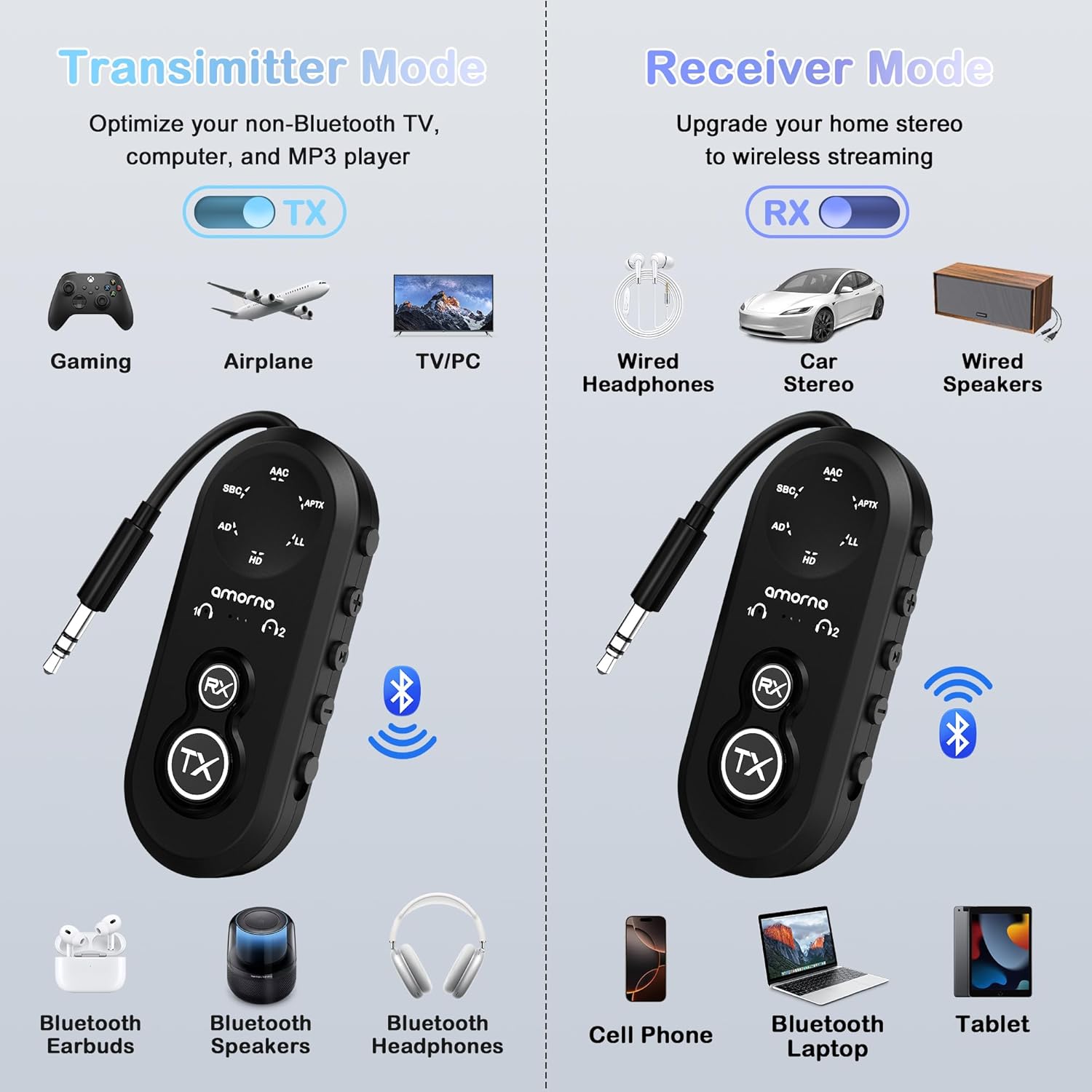 - 2-in-1 Bluetooth Transmitter Receiver: In TX mode, the bluetooth transmitter makes it possible for you to stream audio seamlessly from music, TVs, PCs, CDs, radio station or airplane in-flight entertainment systems to Bluetooth headphones, earbuds, airpods or speakers via a 3.5mm audio jack/RCA Cable/Dual 3.5mm AUX Adapter. In RX mode, the bluetooth receiver allow you to connect your cellphones/tablet to wired speakers/earphones/headphones, car stereos, boat stereos, gym stereos and etc wirelessly via Bluetooth.