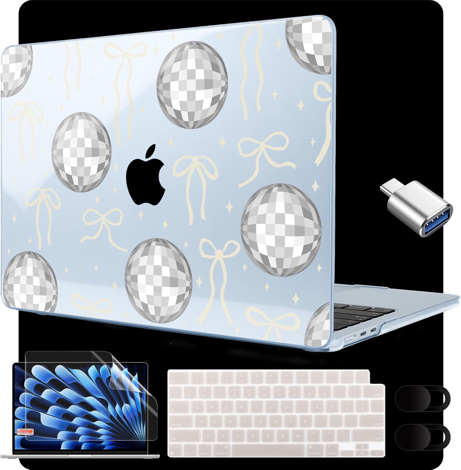 MEEgoodo for M4/M3/M2 MacBook Air 15.3 inch Case 2025 2024 2023, Case Fit Model (A3241/A3114/A2941) for MacBook Air 15 inch, Laptop Hard Shell with Keyboard Cover, Silver Disco Balls & Bows