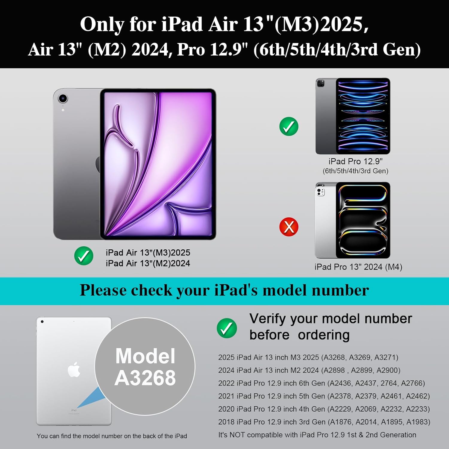 - Compatibility: The ipad case keyboard only works with iPad Air 13 inch (M3 2025, M2 2024), iPad Pro 12.9 inch 6th/5th/4th/3rd Generation. Models include: A3268, A3269, A3271, A2898, A2899, A2900, A2436, A2437, A2764, A2766, A2378, A2461, A2379, A2462, A2229, A2069, A2232, A2233, A1876, A2014, A1895, A1983.