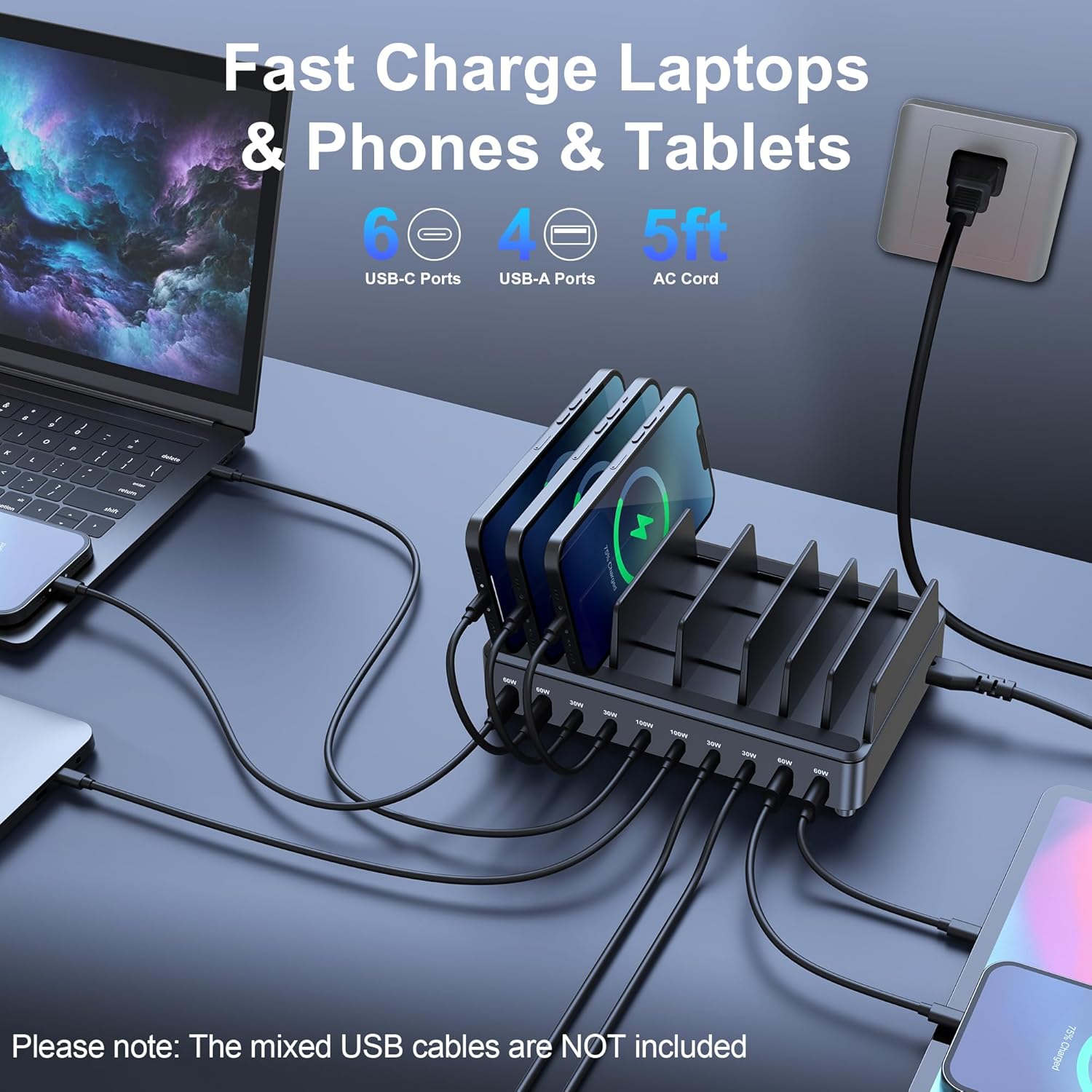 - All-in-One Charging Station: Eliminate multiple chargers and tangled cables! This single station powers all your electronics, making it the perfect solution for home offices, work desks, or travel