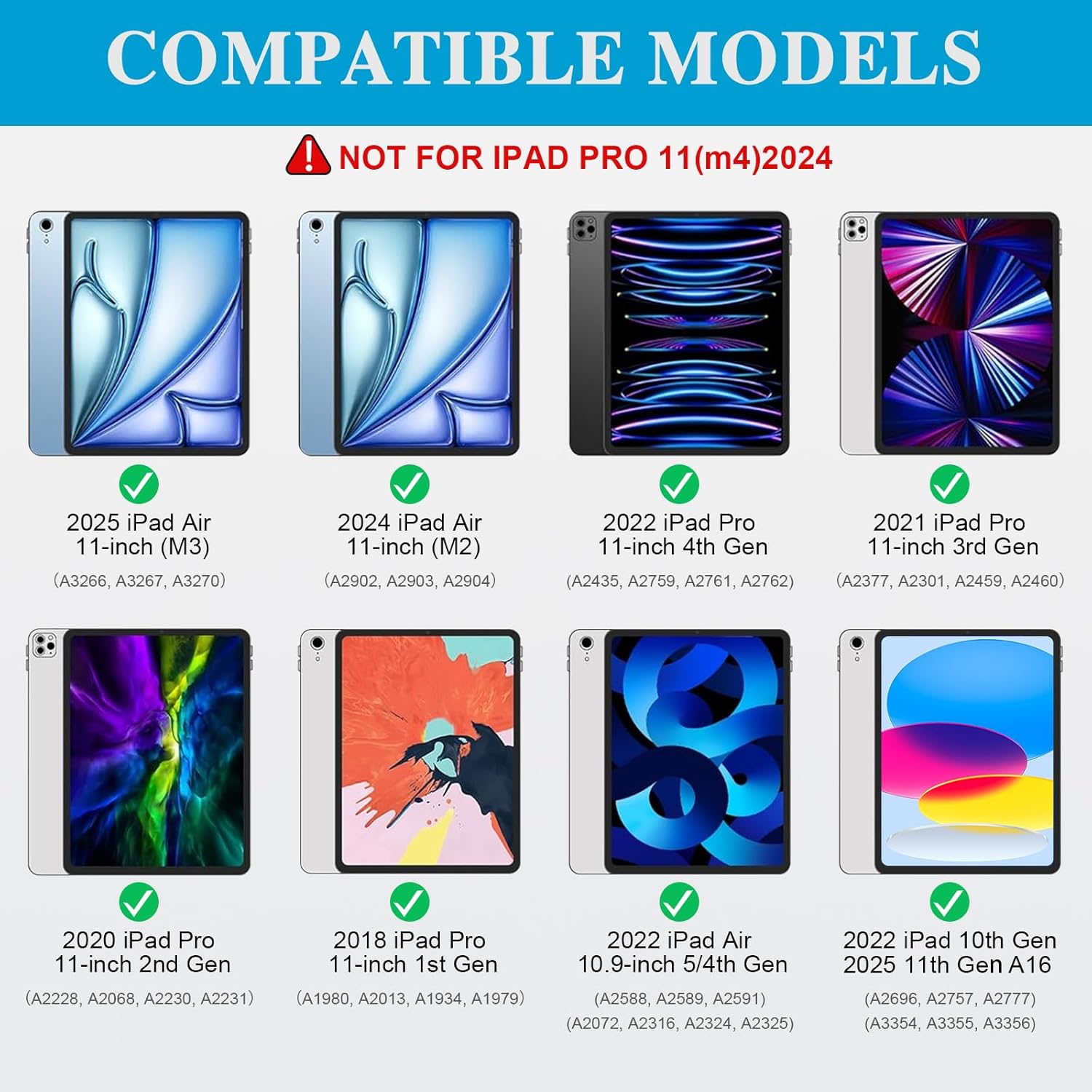- Versatile Compatibility: The iPad keyboard case works with iPad Air 11" (M3 M2, 2025 2024), iPad 11th Gen (A16, 2025), iPad 10th Gen (10.9" 2022), Air 5/4th Gen 10.9"(2022 2021), Pro 11" 4th/3rd/2nd/1st Generation (2022 2021 2020 2018). Models include: A3354, A3355, A3356, A2696, A2757, A2777, A3162, A3266, A3267, A3270, A2902, A2903, A2904, A2435, A2759, A2761, A2762, A2377, A2459, A2301, A2460, A2228, A2068, A2230, A2231, A1980, A2013, A1934, A1979, A2588, A2589, A2591, A2316, A2324, A2325, A2072;