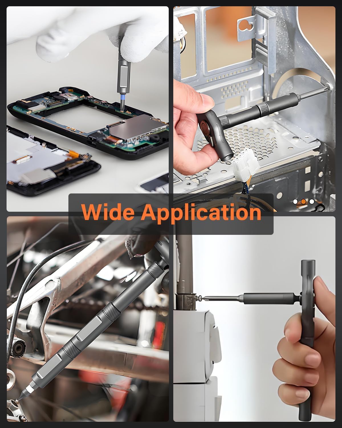 - 【Durable Aluminum Construction】 Precision screwdriver set features an aluminum alloy T-handle and high-strength S2 alloy steel bits that are hard and durable. Designed for heavy-duty use, both components resist wear over time. Different types of bits are colored differently for easy identification and more convenient use