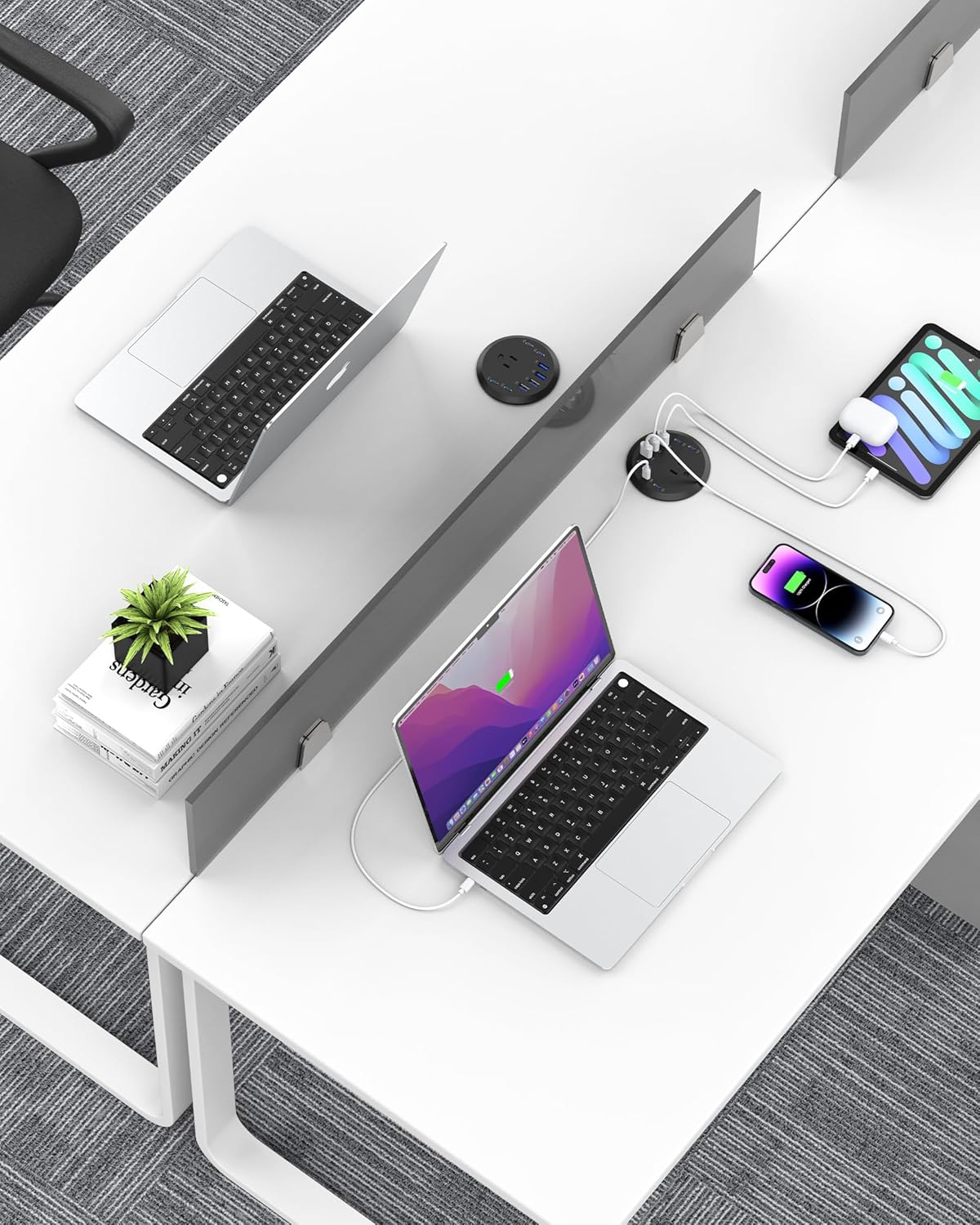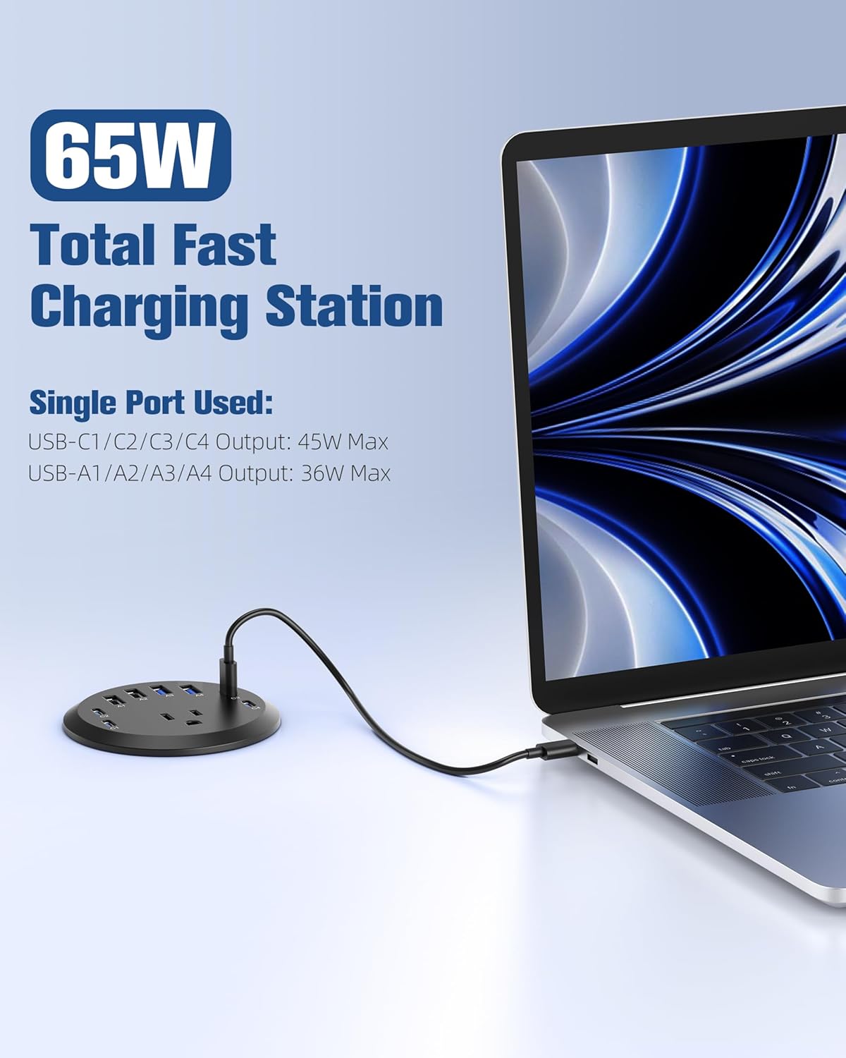 - Quick Power Delivery: We designed our PD 65W USB-C desk power grommet outlet to be as efficient as possible. For quick device charging, it supports cutting-edge USB PD 3.0, QC3.0, and PPS technologies. Use the combination of 4 USB-C and 4 USB-A ports to charge your laptop, smartwatch, phone, and earbuds.