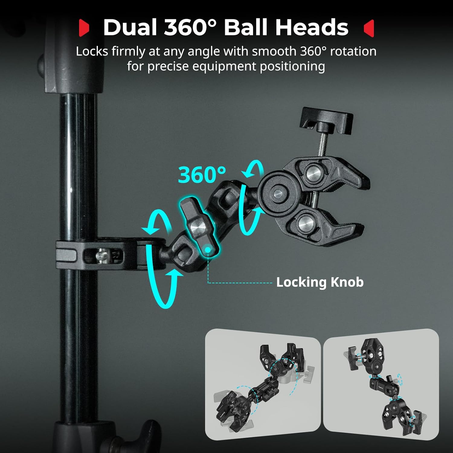 - Stable & Integrated Design: The integrated design at the joint between the crab-shaped clamp and magic arm effectively prevents loosening or detachment during use. Additionally, the 360° adjustable ball head allows for precise positioning, giving you complete control over your setup.