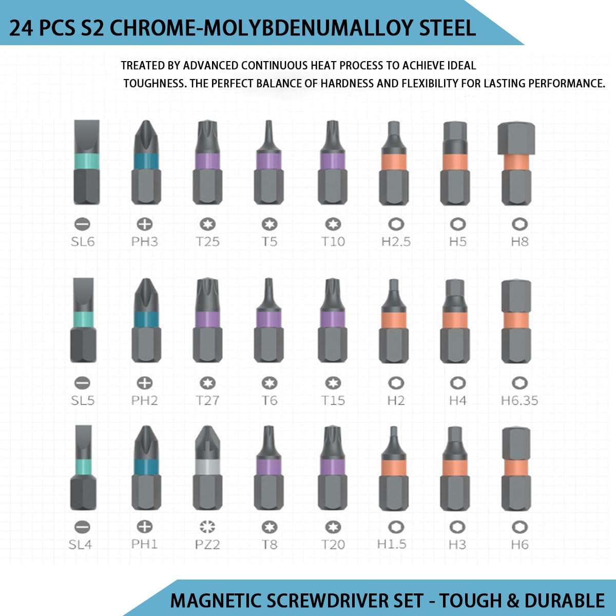 - 24 Premium S2 Steel Magnetic Bits: Be ready for any task. This comprehensive set includes 24 high-strength S2 chrome-molybdenum steel bits (6.35mm / 1/4") featuring Phillips, Slotted, Pozidriv, Torx, and Hexagon types – ideal for professional repairs, DIY, home, electronics, furniture, and bicycles.