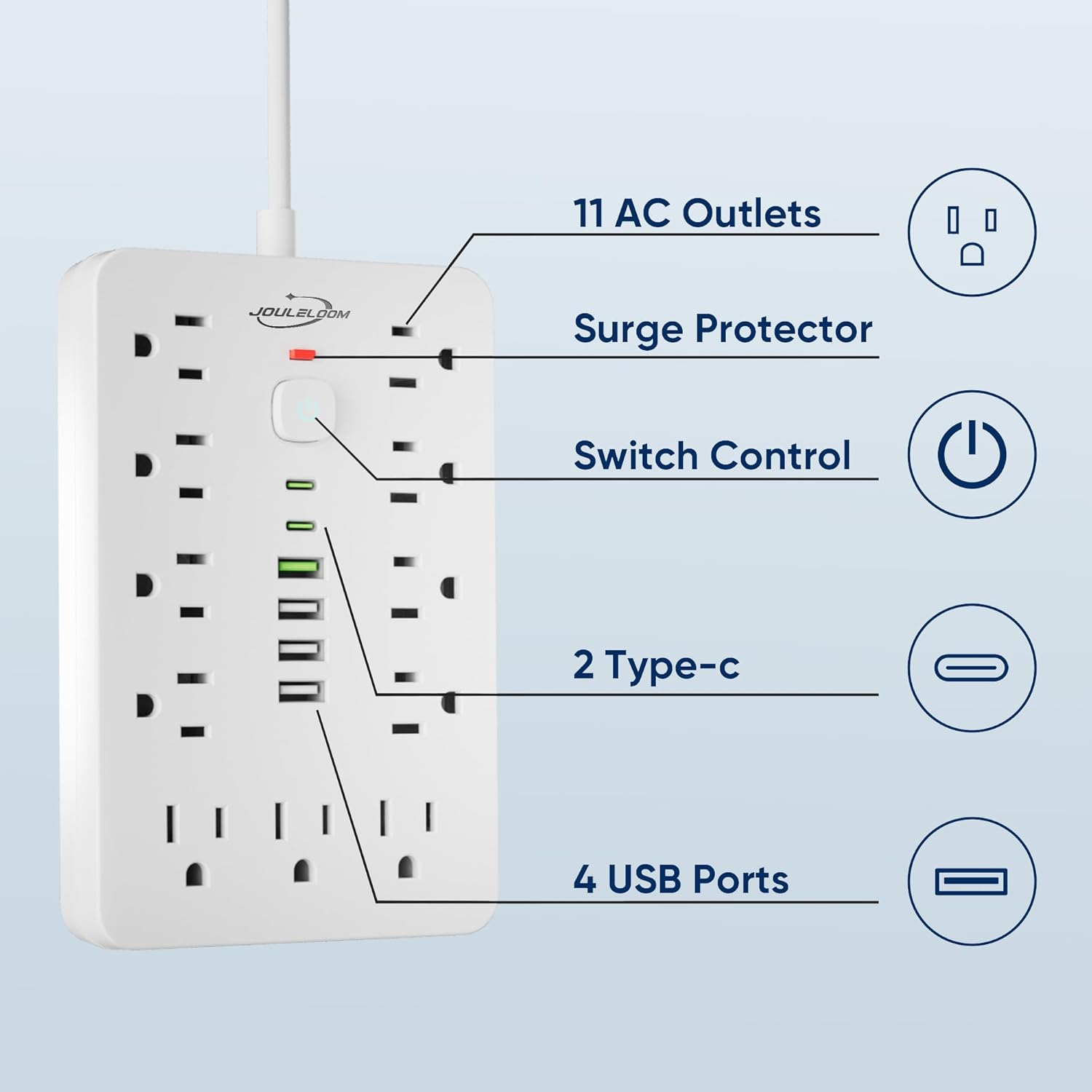 - 🛡️【Multiple Security Protection】JouleLoom 17in1 power strip integrates an 8-point safety system, including surge protection, fire resistance, overload protection, temperature control, and more. It has overload protection and will light up red during normal operation. When overloaded, the power switch will automatically trip to protect the equipment. Press the switch to restore. It ensures complete safety for you and your devices, whether at home or in the office, for long-lasting and stable operation.
