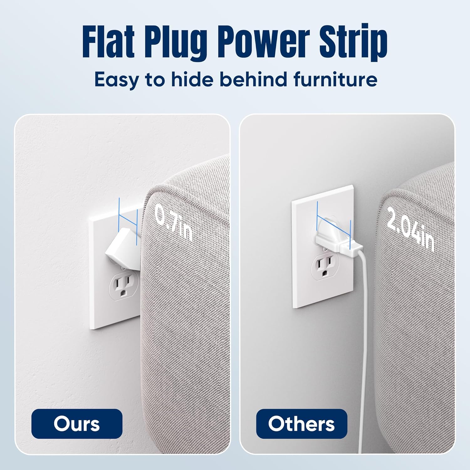 - 🏠【Space Saving Design】- Experience the ultimate in space efficiency with JouleLoom 15FT surge protector's slim flat plug, measuring a mere 0.7 inches thick. Unlike traditional plugs, its unique 45-degree right-angle design ensures it won't obstruct neighboring outlets. Plus, with two multi-directional hanging holes, you can easily mount it horizontally or vertically on workstations, walls, counters, bedrooms, optimizing your space like never before.