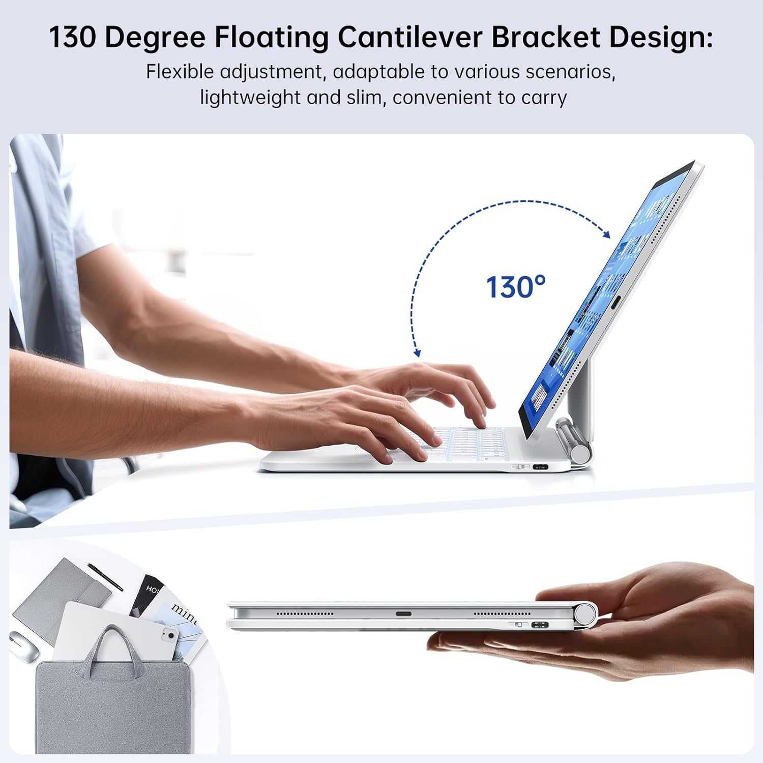 - 【Magnetic cantilever design】: using advanced magnetic adsorption technology, it can be tightly attached to an 11 inch tablet computer to form a stable connection. The cantilever design allows the tablet to achieve flexible adjustment from multiple angles, up to a maximum of 130 degrees, meeting the viewing and usage needs of users in different scenarios. For example, when watching videos, the screen can be adjusted to a suitable elevation angle, and when typing, the screen can be adjusted to a more user-friendly angle.