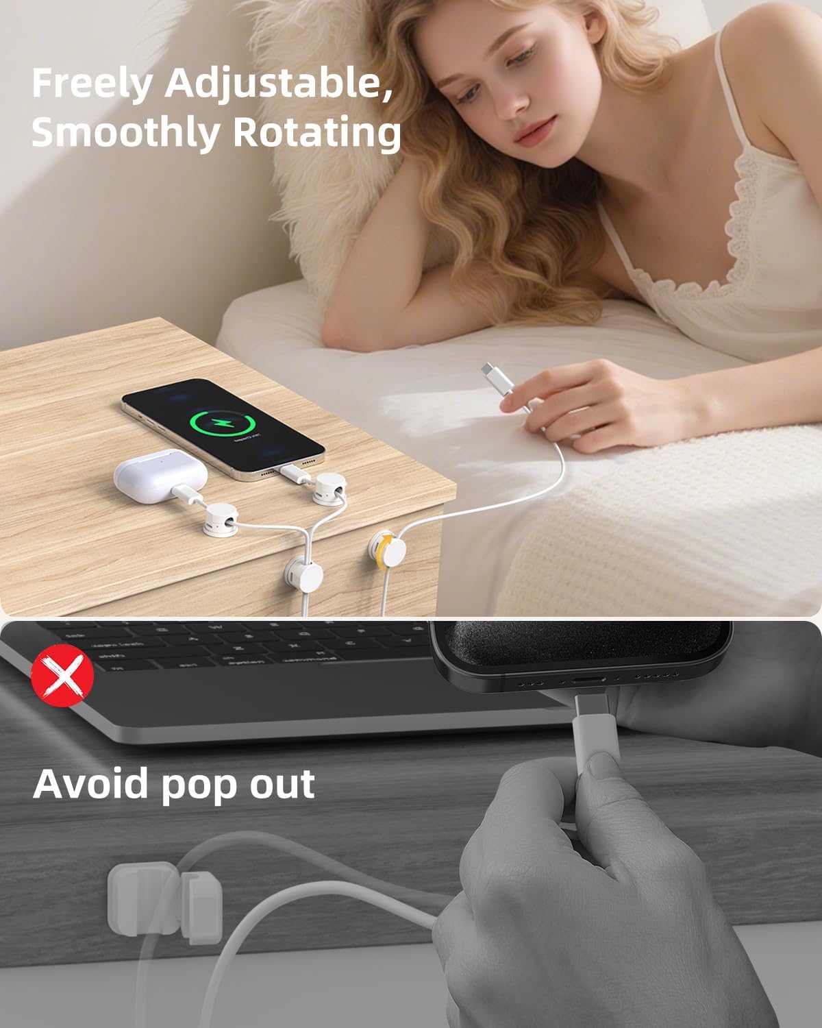- 360° Swivel Design: Our cord holder feature a smooth 360° rotation, allowing you to spin and position cords any way you need. With a slot diameter up to 8mm (0.32"), our cord holder can securely hold a wide range of wires, including Type-C chargers, Lightning cables, HDMI cords, USB cables, power cords, network cables, headphones, and more.