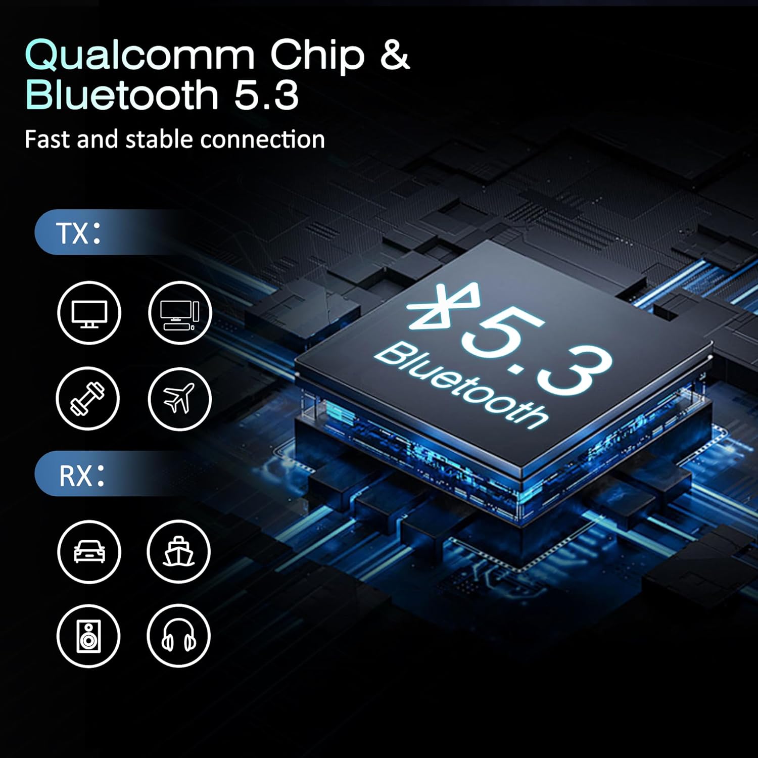 - Bluetooth 5.3 & Qualcomm Chip: Swiitech Bluetooth transmitter receiver adopts Bluetooth 5.3 and a Qualcomm Chip, which ensures stable and fast connections. In TX mode, Bluetooth transmitter connects non-Bluetooth audio sources via 3.5mm jack or RCA cable such as airplanes, TVs, or MP3 players with Bluetooth-enabled speakers, headphones. In RX mode, Bluetooth adapter receives audio from a smartphone or other Bluetooth source device and then transmits the audio to non-Bluetooth wired speakers, car/home stereos, headphones via a 3.5mm AUX cable.