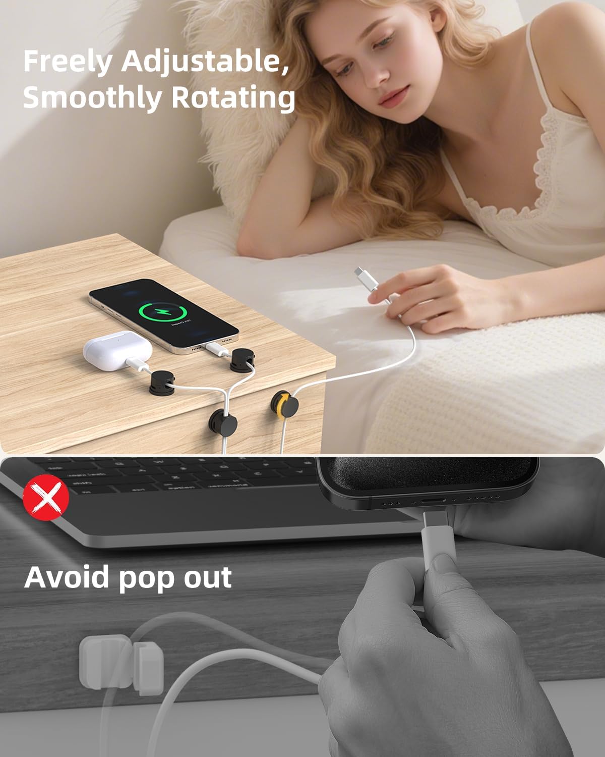 - 360° Swivel Design: Our cord holder feature a smooth 360° rotation, allowing you to spin and position cords any way you need. With a slot diameter up to 8mm (0.32"), our cord holder can securely hold a wide range of wires, including Type-C chargers, Lightning cables, HDMI cords, USB cables, power cords, network cables, headphones, and more.