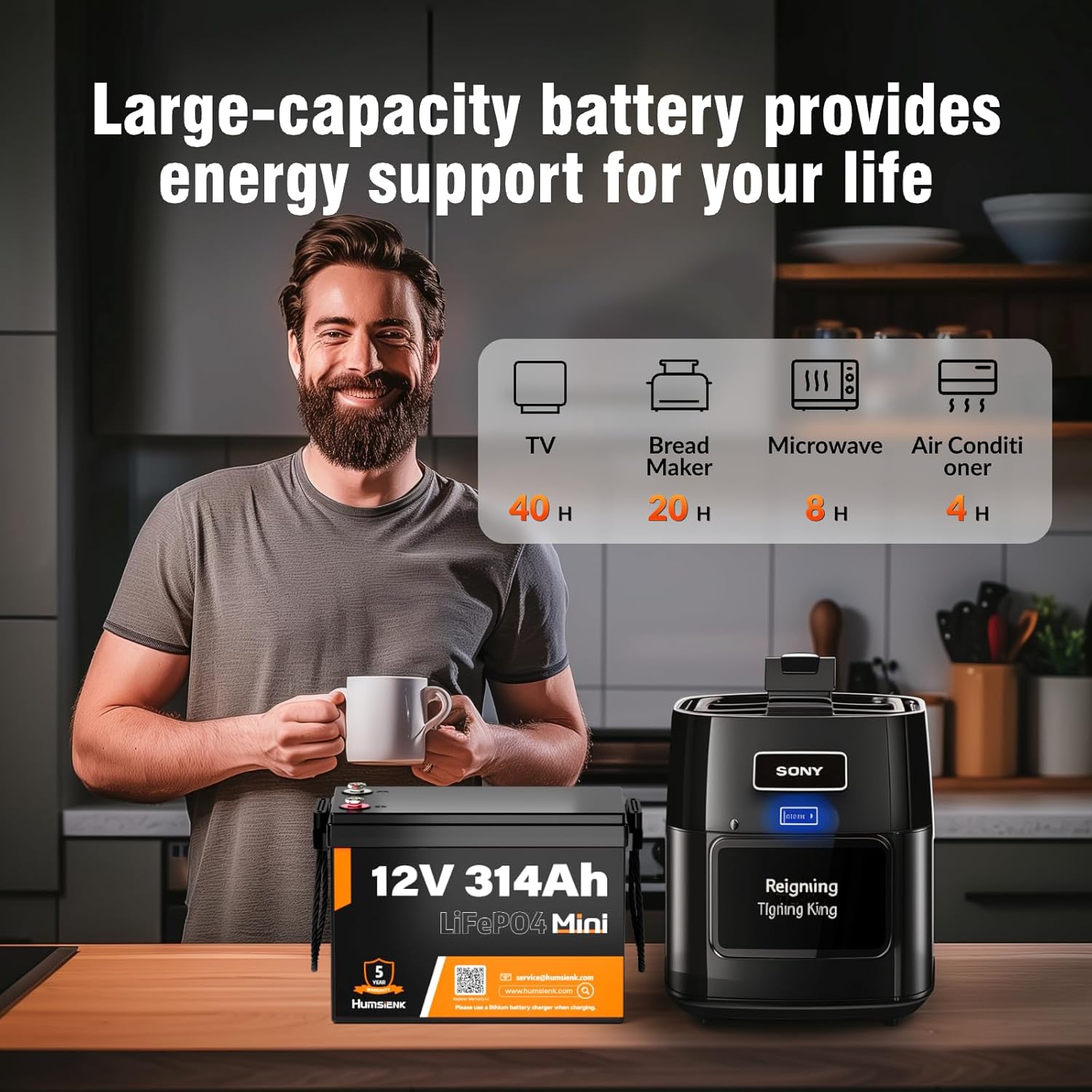 - 【4.19kWh & 15,000+ Deep Cycles】Our 12V 314Ah LiFePO4 battery offers an impressive 15,000+ deep cycles, lasting 30 times longer than traditional 300Ah lead-acid batteries. Fully charged, the LiFePO4 battery delivers 4.19kWh of energy with nearly 100% depth of discharge (DOD), ensuring reliable power for your devices. surpassing three 12V100Ah/ 12V 300Ah lithium batteries connected in parallel. Perfect for RVs, solar systems, home storage, trolling motors, and marine use. Supports up to 4S4P configurations for a maximum capacity of 64.307 kWh.