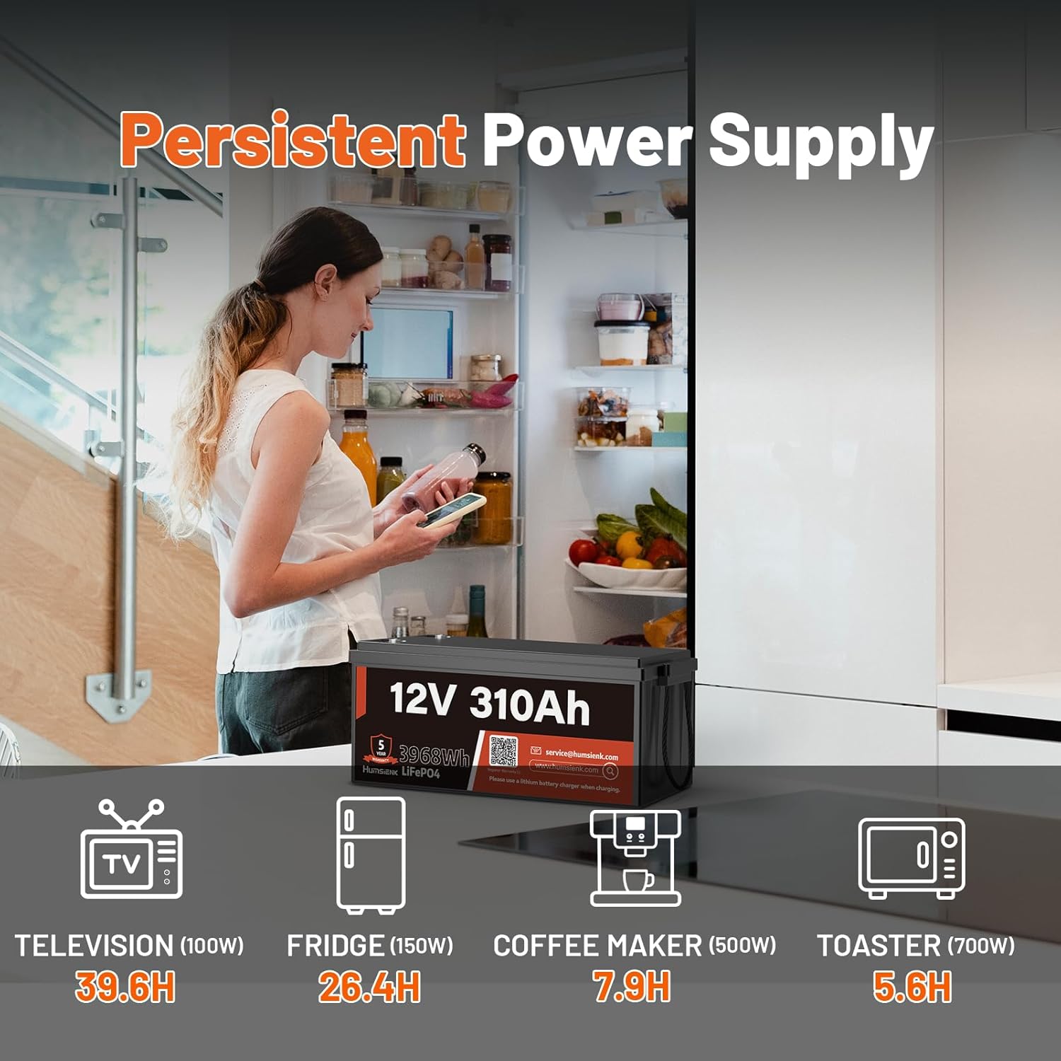 - 🚀 15,000+ Deep Cycles & 10-Year Lifespan: HumsiENK 310Ah LiFePO4 Battery with 3968Wh capacity & 100% Depth of Discharge (DOD) – Lasts 30x longer than lead-acid batteries, perfect for solar energy storage, RV power, off-grid living, and marine trolling motors.