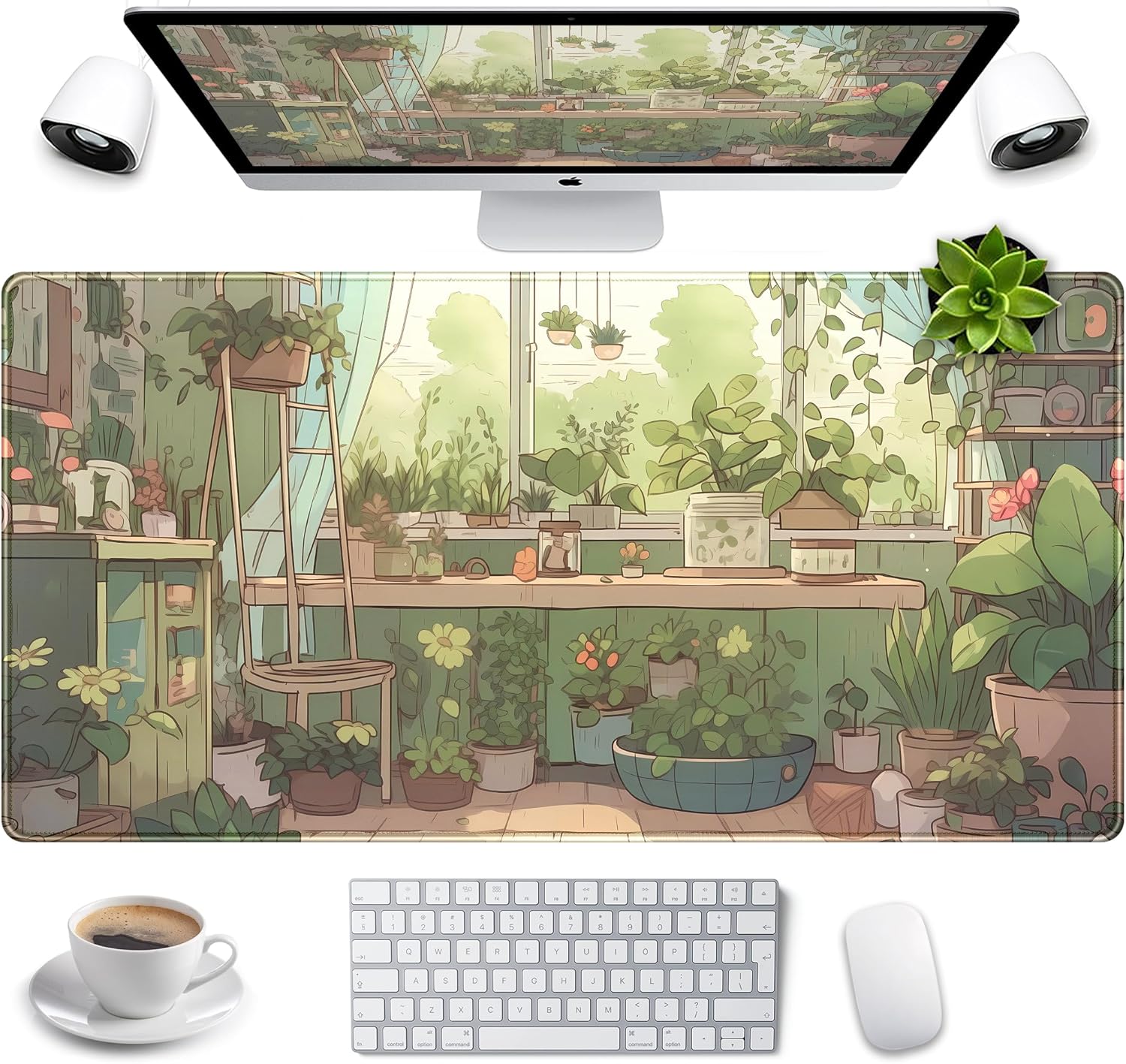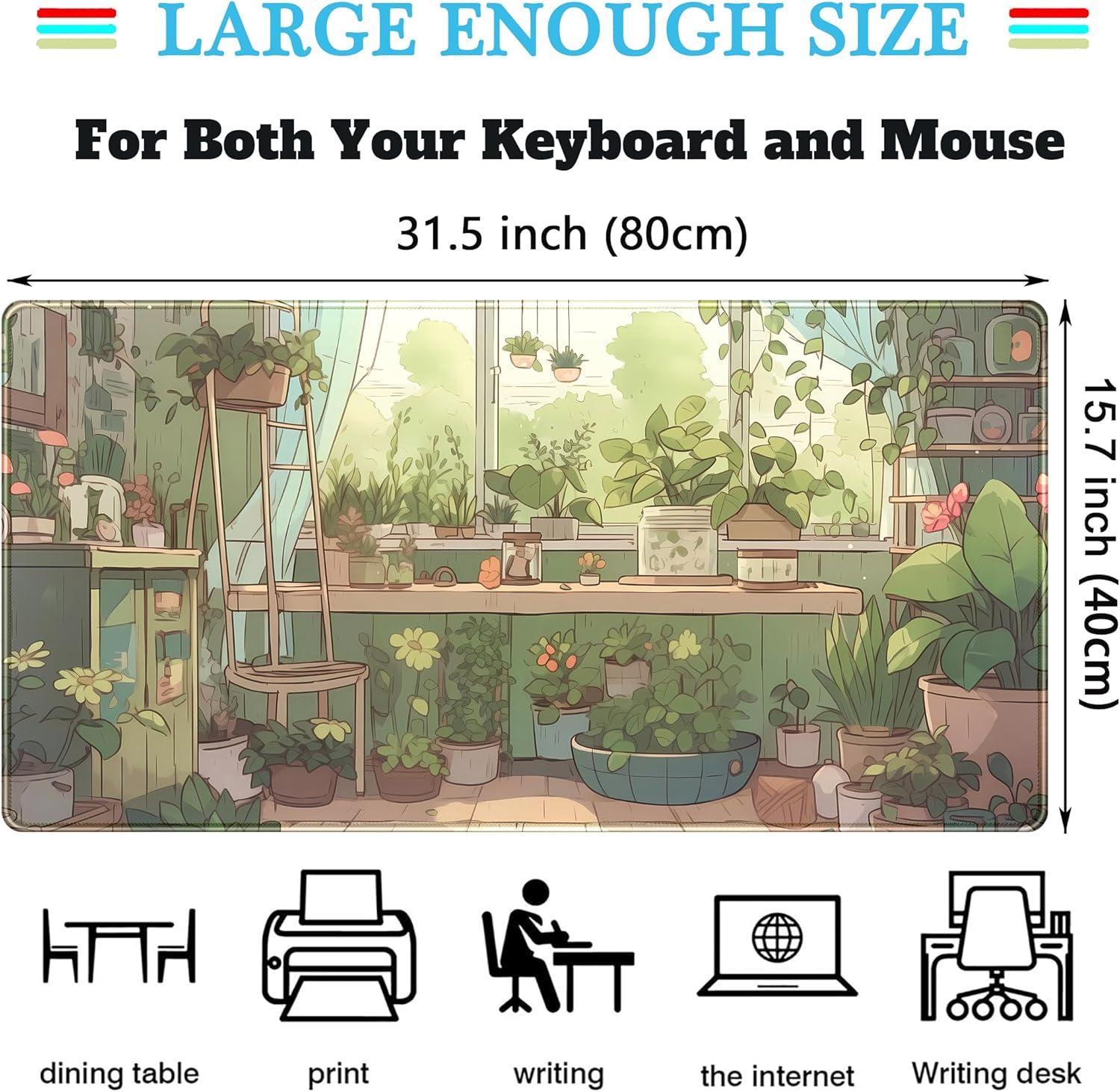 Cute Desk Mat Green Plants Gaming Mouse Pad XXL Large Extended Sage Laptop Keyboard and Mouse Mat with Stitched Edges, Computer Desktop Mat Playmat for Women Office Desk Decor Pad Mat 31.5x15.7 in