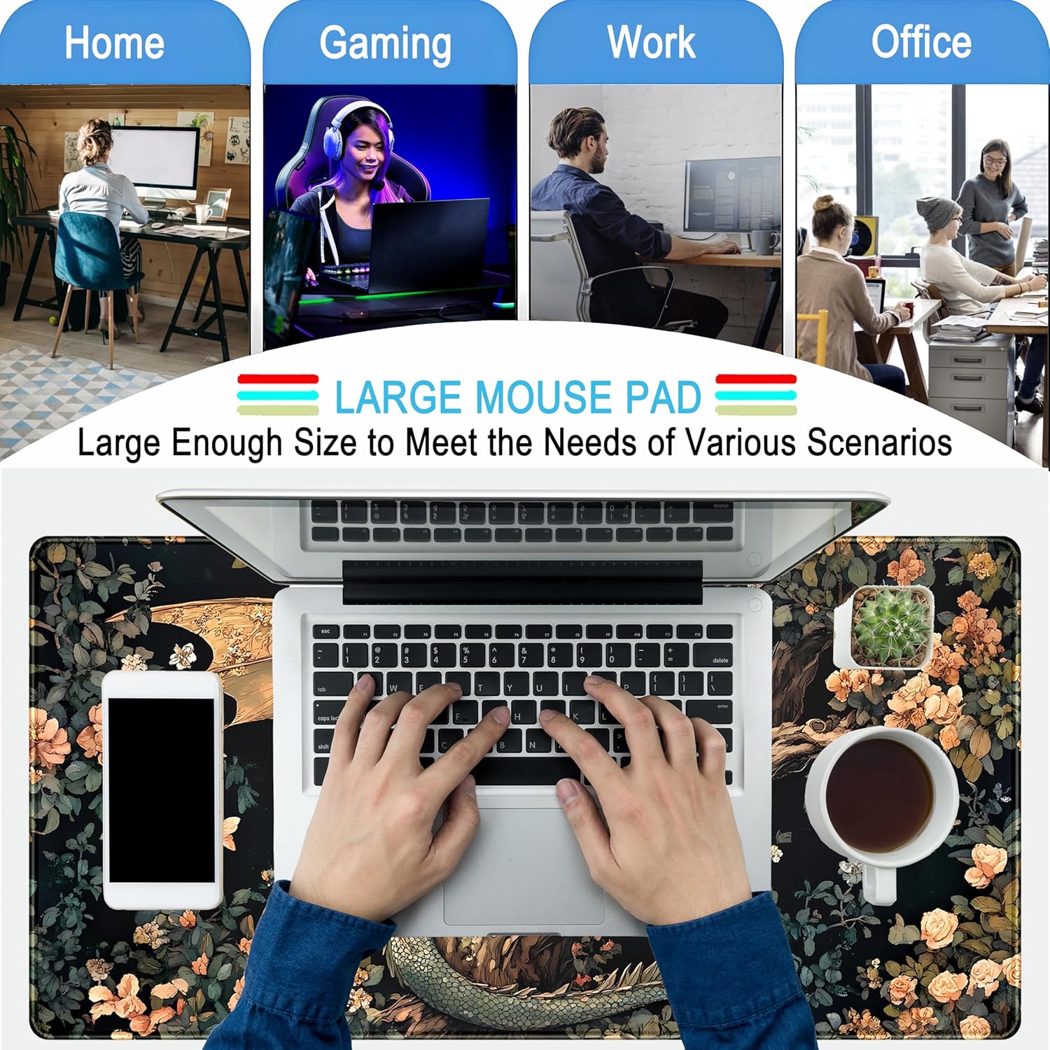 Desk Mat Cute Enchanted Forest Dragon Kawaii Mouse Pad XXL Large Extended Vintage Academia Anime Desk Pad, Cozy Computer Playmat Laptop Keyboard and Mouse Mat with Stitched Edges, 31.5x15.7 in