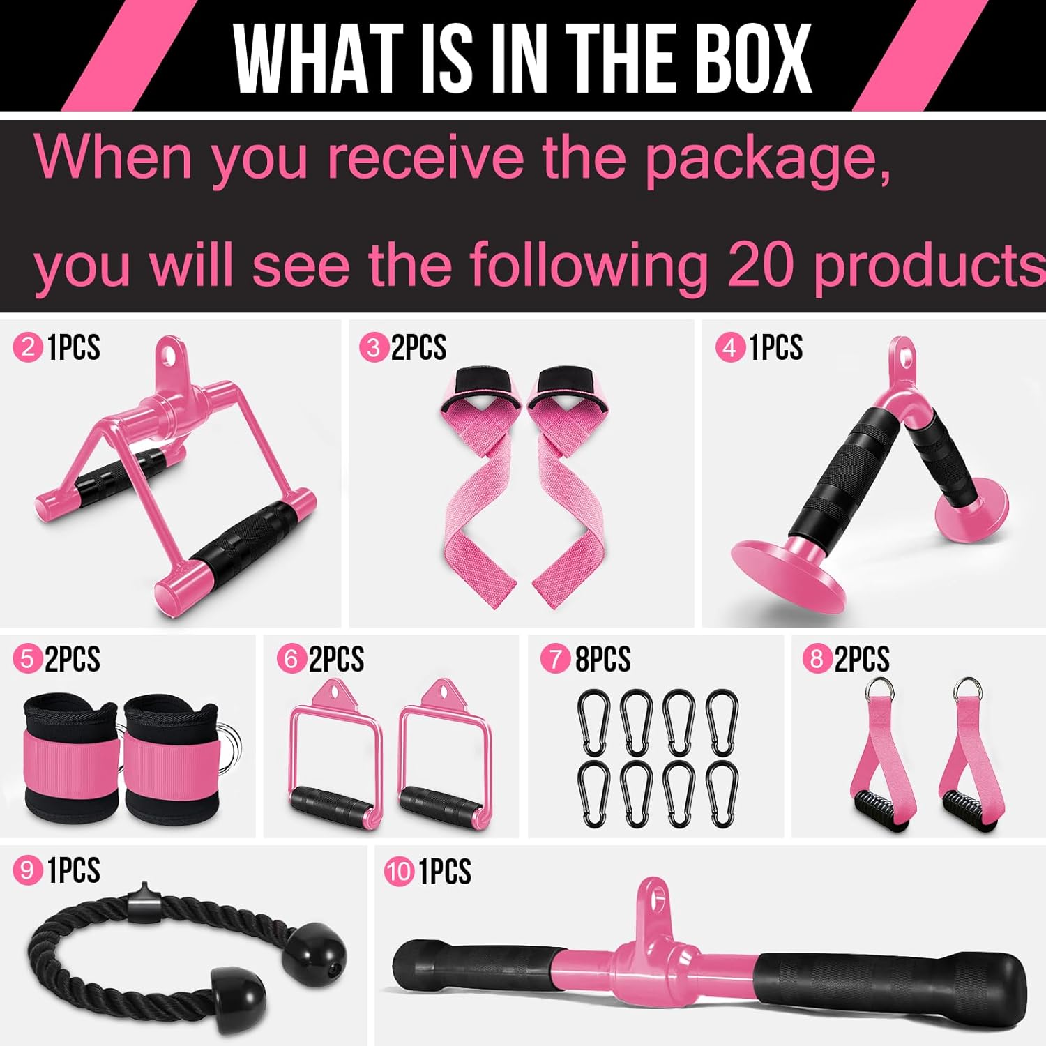 - 💪【Lat Pulldown Attachments Set】: Includes:1x Tricep Rope, 1x Double D Handle, 1x V-Shaped Bar, 1x Straight Rotating Bar, 2x Single D Handle, 2x Cable Machine Handle, 2x Ankle Straps,2 x Lifting Wrist Straps and 8 x Snap Hooks . These home gym accessories for men and women are designed to fit most cable systems.