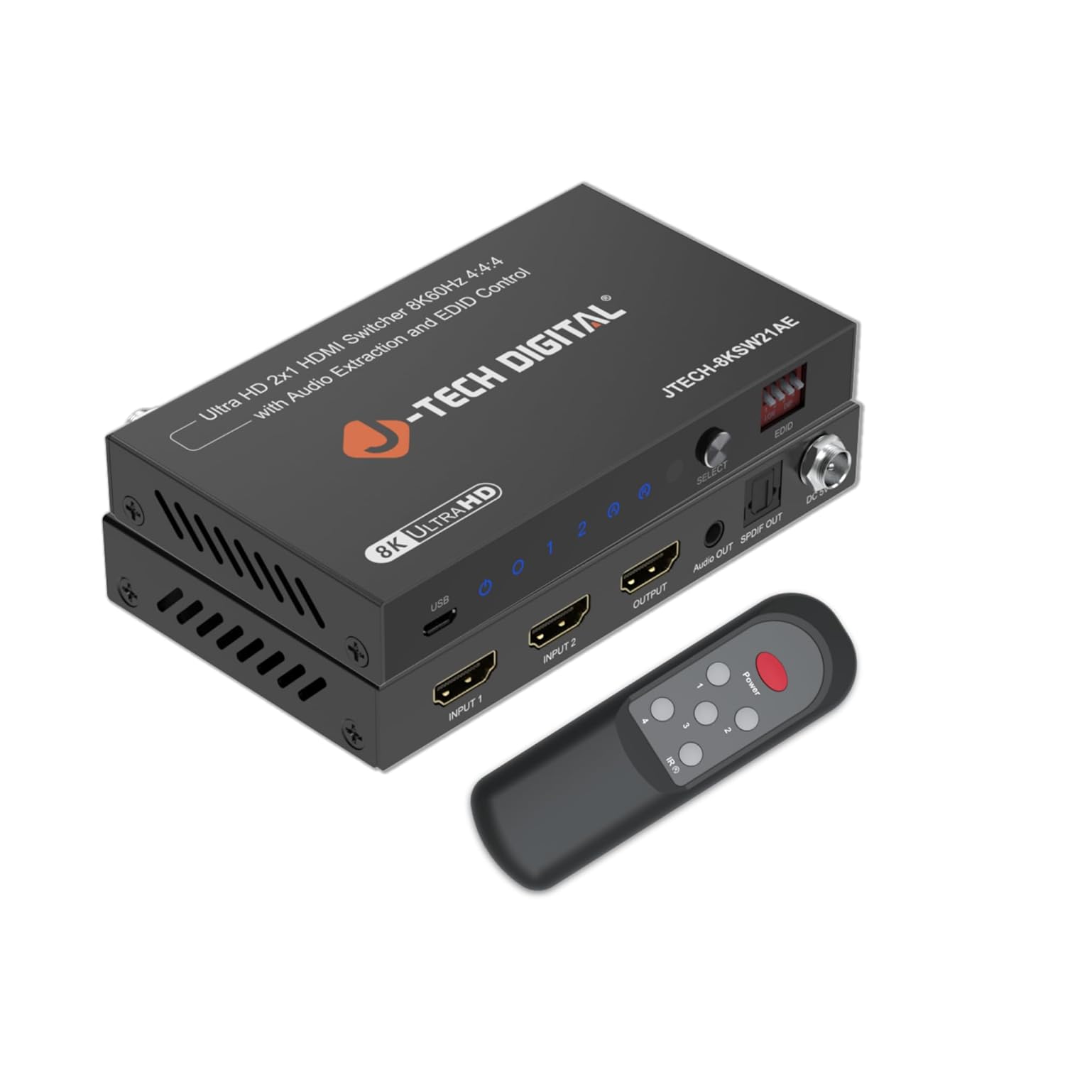 8K HDMI Switch 2 in 1 Out, 8K@60Hz 4K@120Hz 1080P@240Hz with Audio Extraction, HDMI to Optical & Analog 3.5mm, HDR HDCP2.3 EDID Control (JTECH-8KSW21AE)