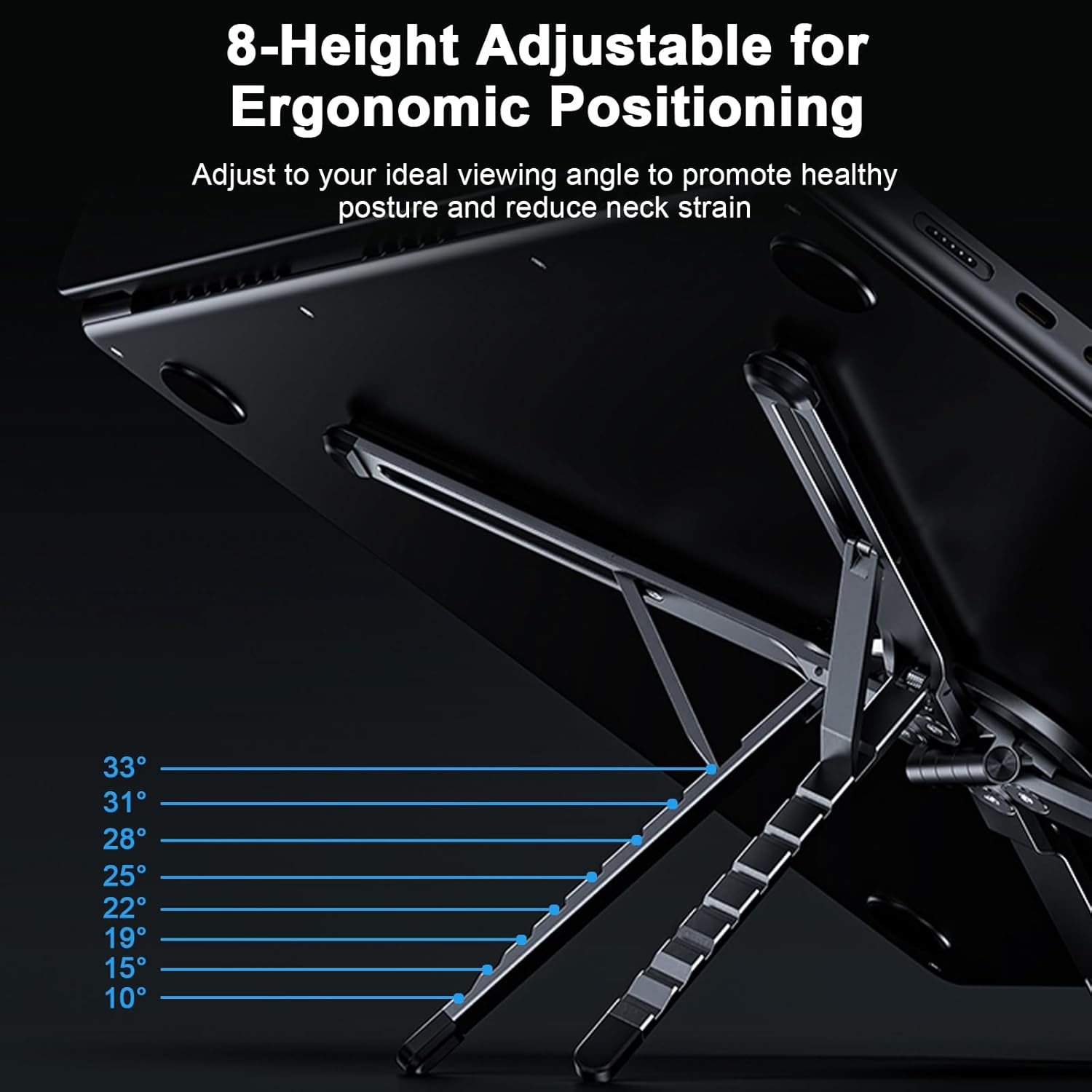 - 【Ergonomic 8-Angle Adjustment】Elevate your screen to the perfect eye level with 8 precise height adjustments, from 10° to 33°. This promotes a healthier posture to effectively reduce strain on your neck, back, and eyes during long hours of use. Whether you're working from home, in the office, or on a business trip, this foldable laptop stand helps you create a comfortable and productive workspace anywhere you go