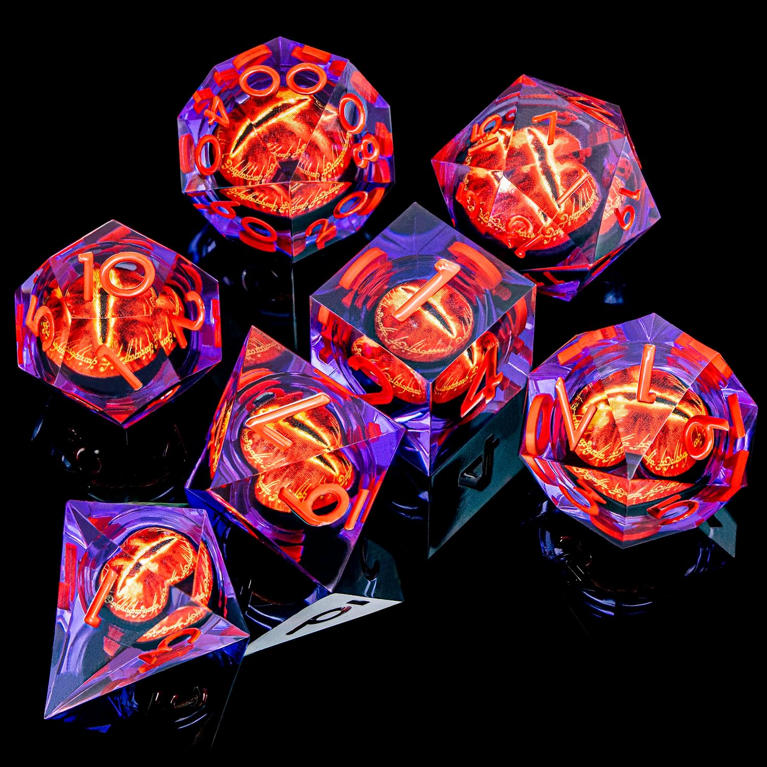 ARUOHHA DND Resin Dice Gazes Eye Dice Purple Red Liquid Core Flaming RPG Sharp Edged Dice Set with Gift Box, Polyhedral D and D Dice Set Compatible with Dungeons Dragons Role Playing Game D20 D6