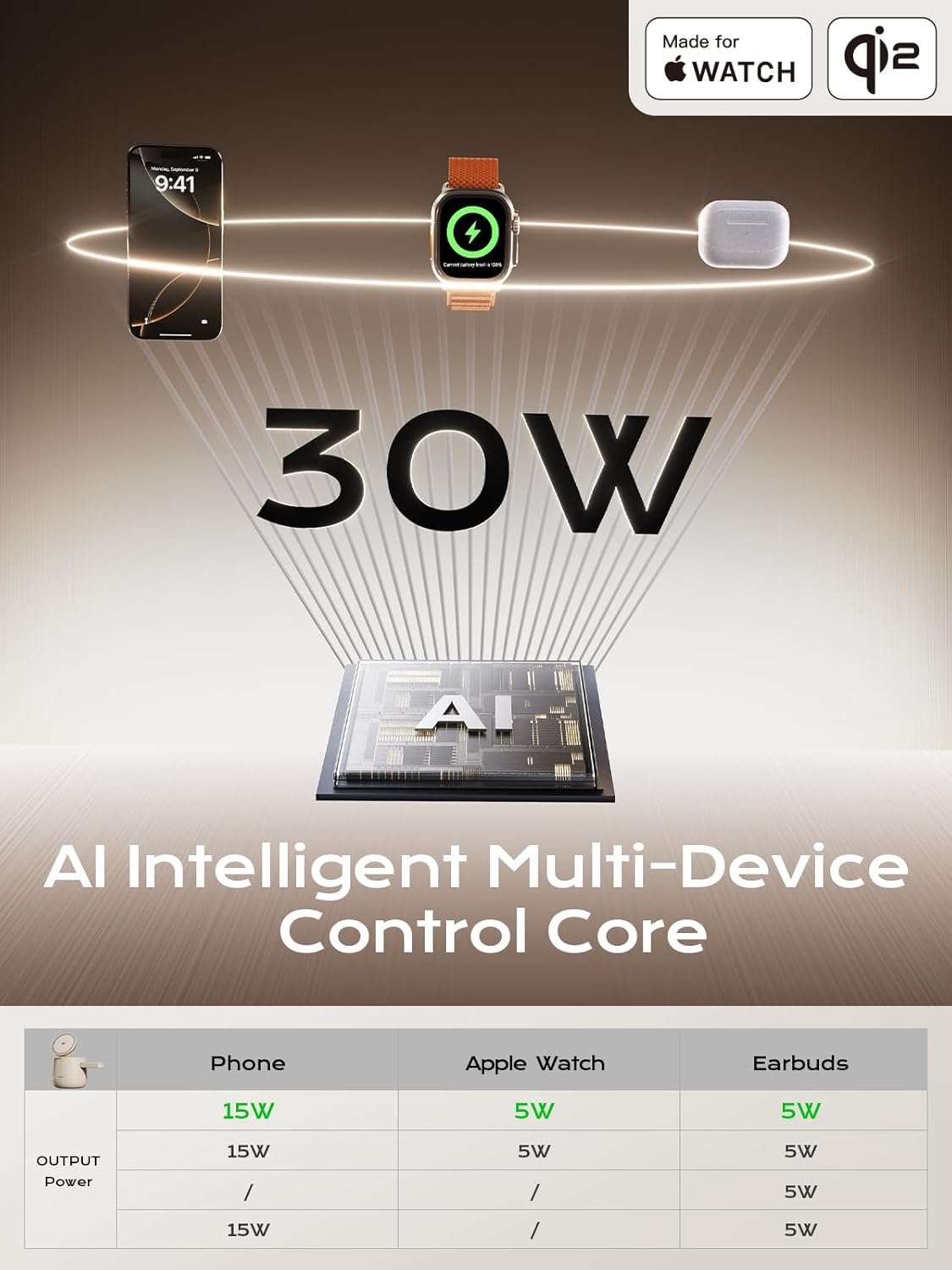 - 🔒【Advanced AI Intelligent Chips Control Core】Powered by 5 exclusive TK-AI Chips, this qi2 3 in 1 magsafe charger ensure exceptional safety, efficiency and thermal management. The AI chips inside optimizes power delivery to provide comprehensive 360° protection against overheating, overvoltage, overcurrent, overcharge and short-circuit, safeguarding your device's longevity and potentially extending battery life.