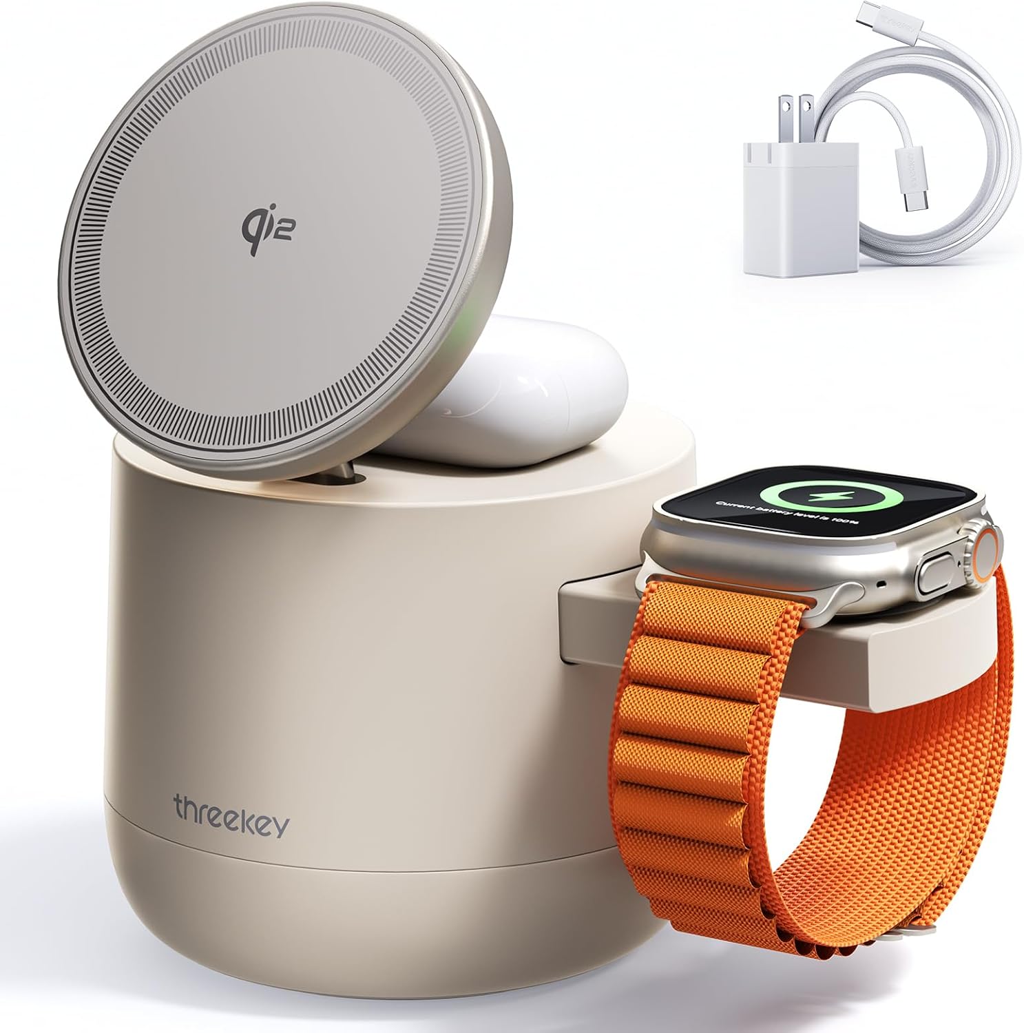 - 🍃【StandBy Ready & Flexible Positioning Up to 70°】Style your iPhone as you'd like, as Threekey's iphone apple watch and airpods charging station supports StandBy Mode. Your phone will remain in the perfect position as you turn it into a bedside clock, photo frame, widget display, and more. Effortlessly toggle between landscape and portrait orientations for optimal viewing comfort, while maintaining a reliable charge to your device.