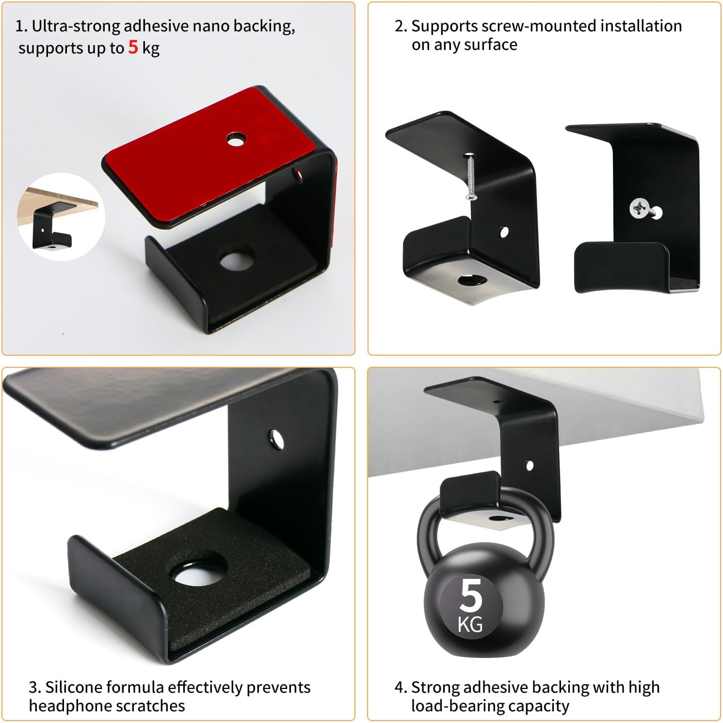 - 【Secure Adhesion】The headphone stand under desk features nano-adhesive tape that firmly attaches to smooth, clean surfaces such as plastic, metal, wood, or glass. The tape peels off cleanly without leaving residue.