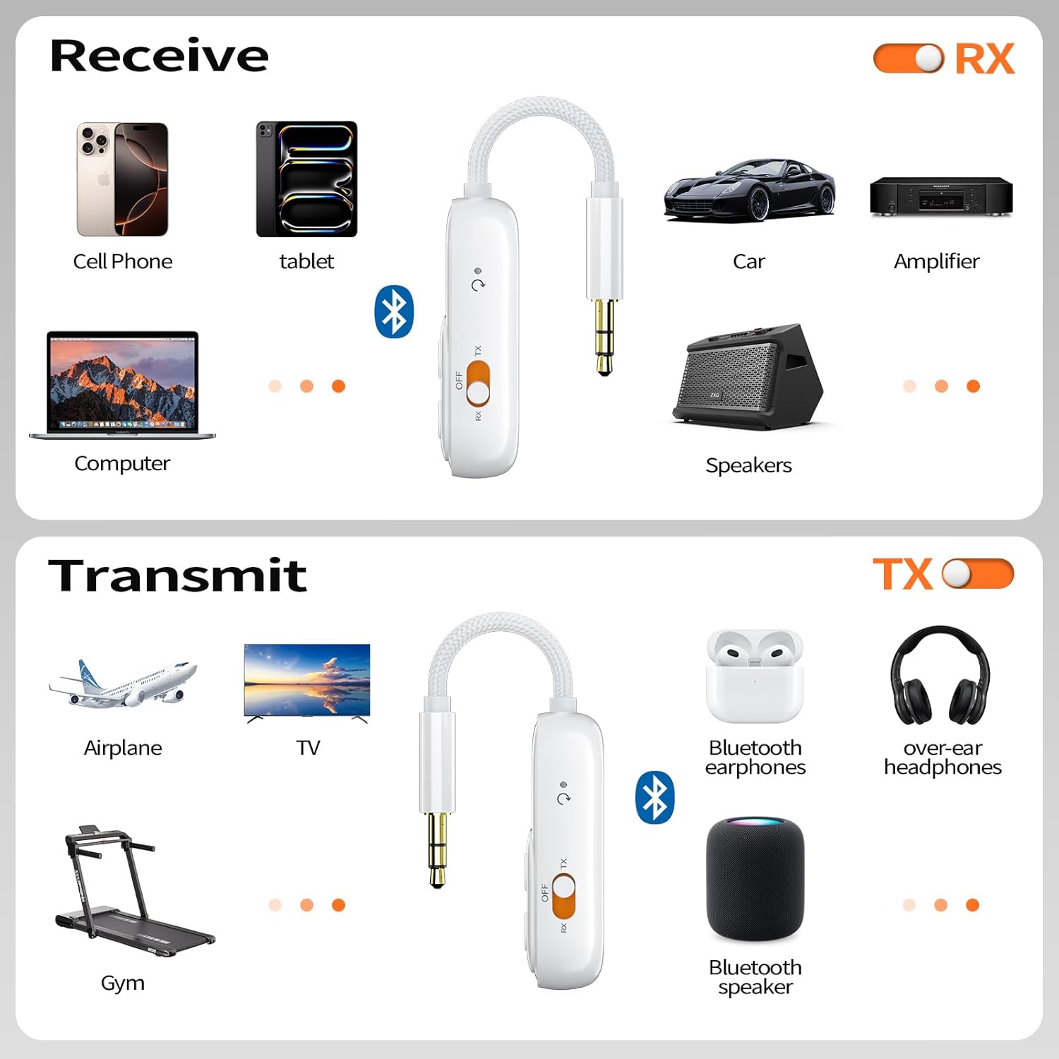 - 2-in-1 Bluetooth transmitter and receiver: This compact 3.5mm Bluetooth transmitter supports both transmit (TX) and receive (RX) modes. Whether you're connecting to your home speakers, your car system, or using entertainment devices on an airplane, it's instantly compatible, giving non-Bluetooth devices an instant wireless upgrade.