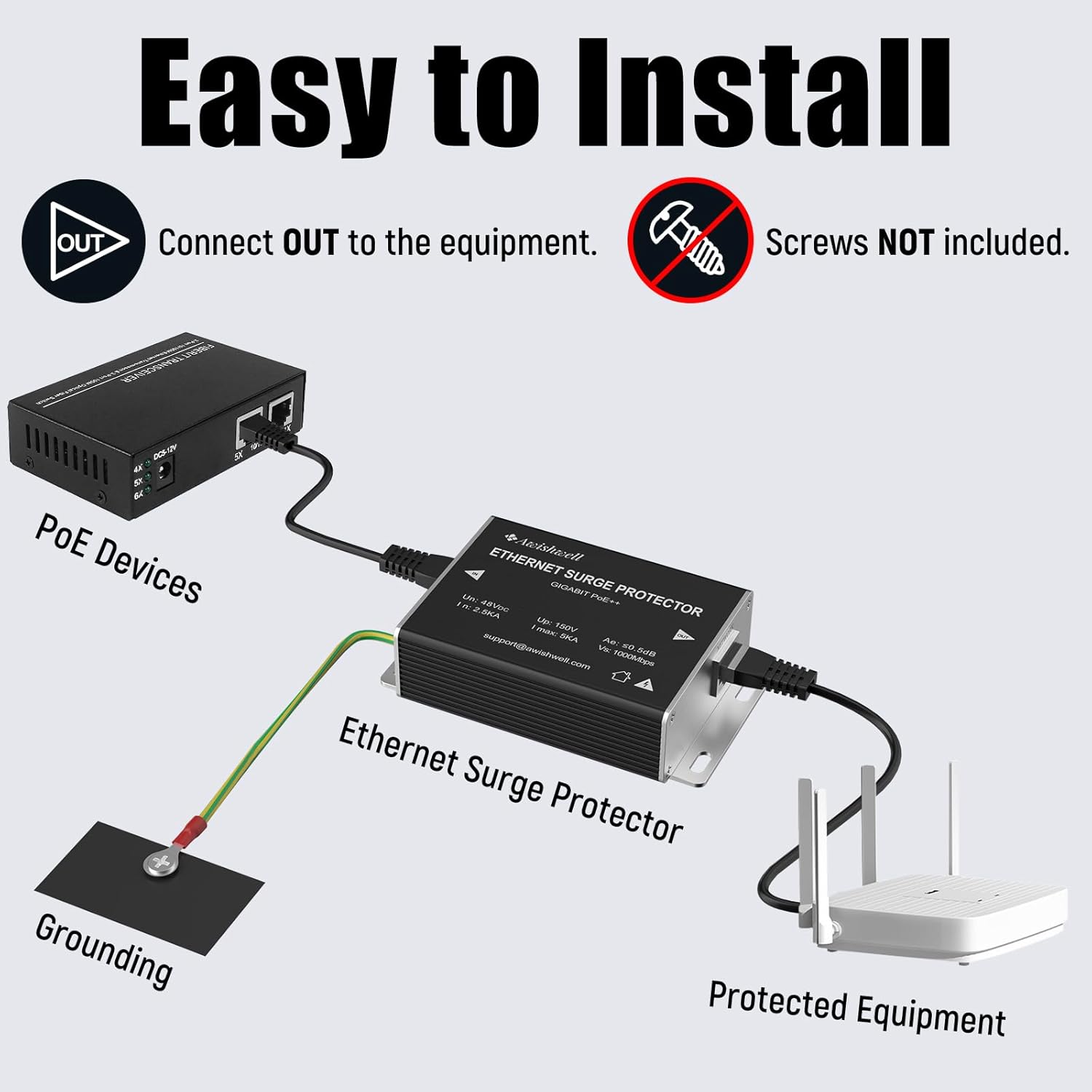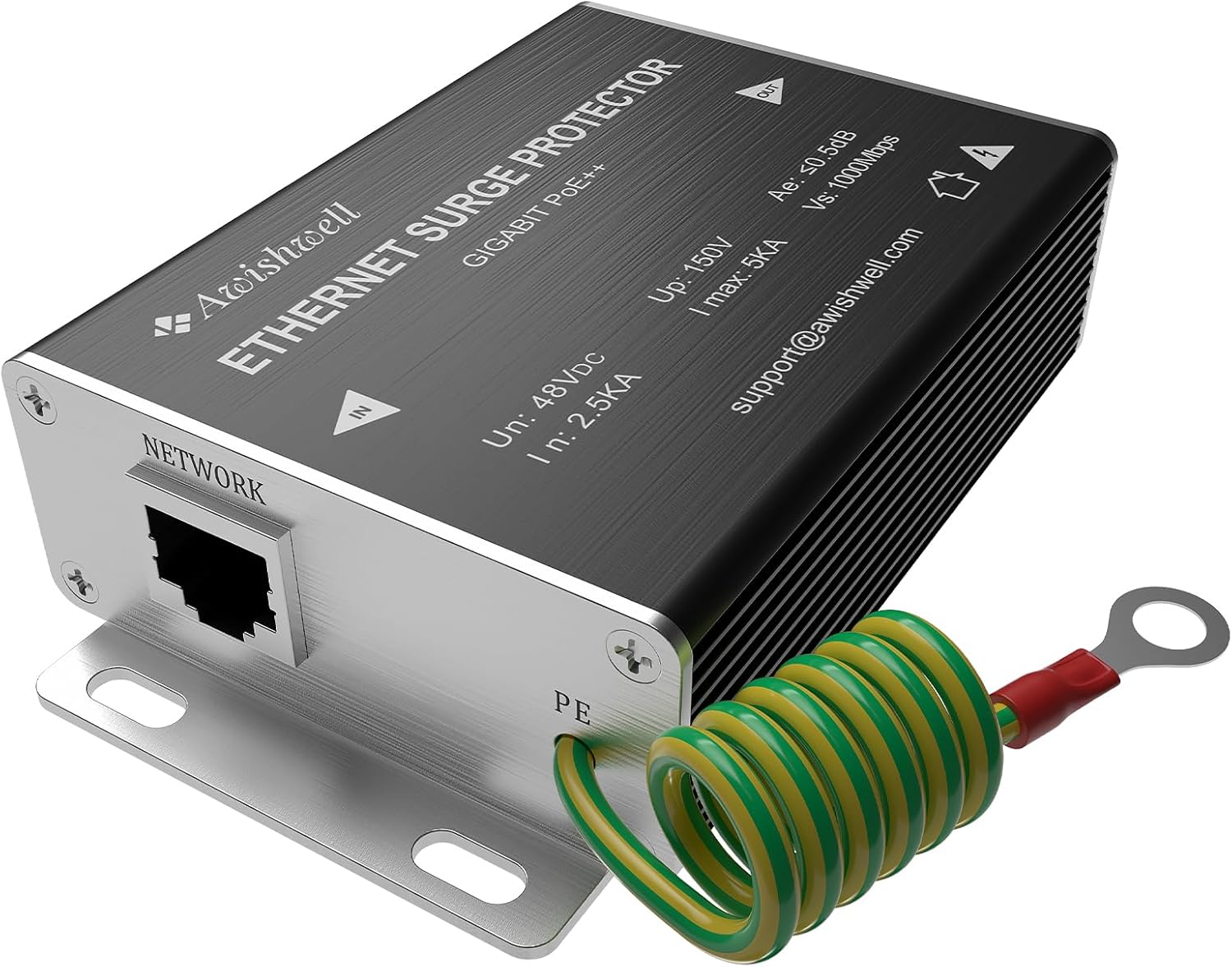 - 【Surge Protection】:Ethernet surge protector is designed to protect equipment against transients from lightning, ESD, and ground surges. Awishwell surge protector supports speeds up to 1 Gigabit -1000 Mbps, and provides PoE++ 802.3af/at/bt compatibility with 3KV surge protection, without affecting network performance. Peak surge current protection up to standard 5KA 8/20μs