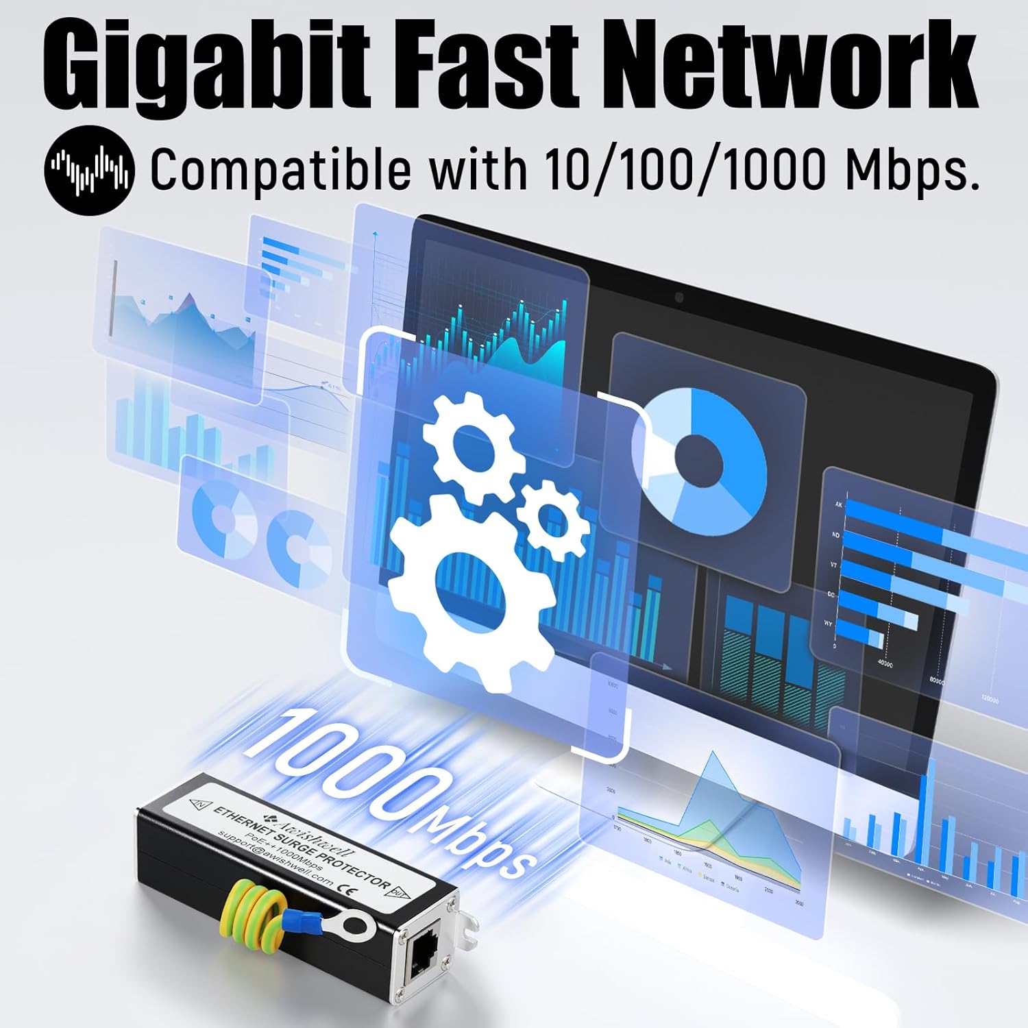 - 【Surge Protection】: Ethernet surge protector is designed to protect equipment against transients from lightning, ESD, and ground surges. Awishwell surge protector supports speeds up to 1 Gigabit -1000 Mbps, and provides PoE++ 802.3af/at/bt compatibility with 10KV surge protection, without affecting network performance. Peak surge current protection up to standard 20KA 8/20μs