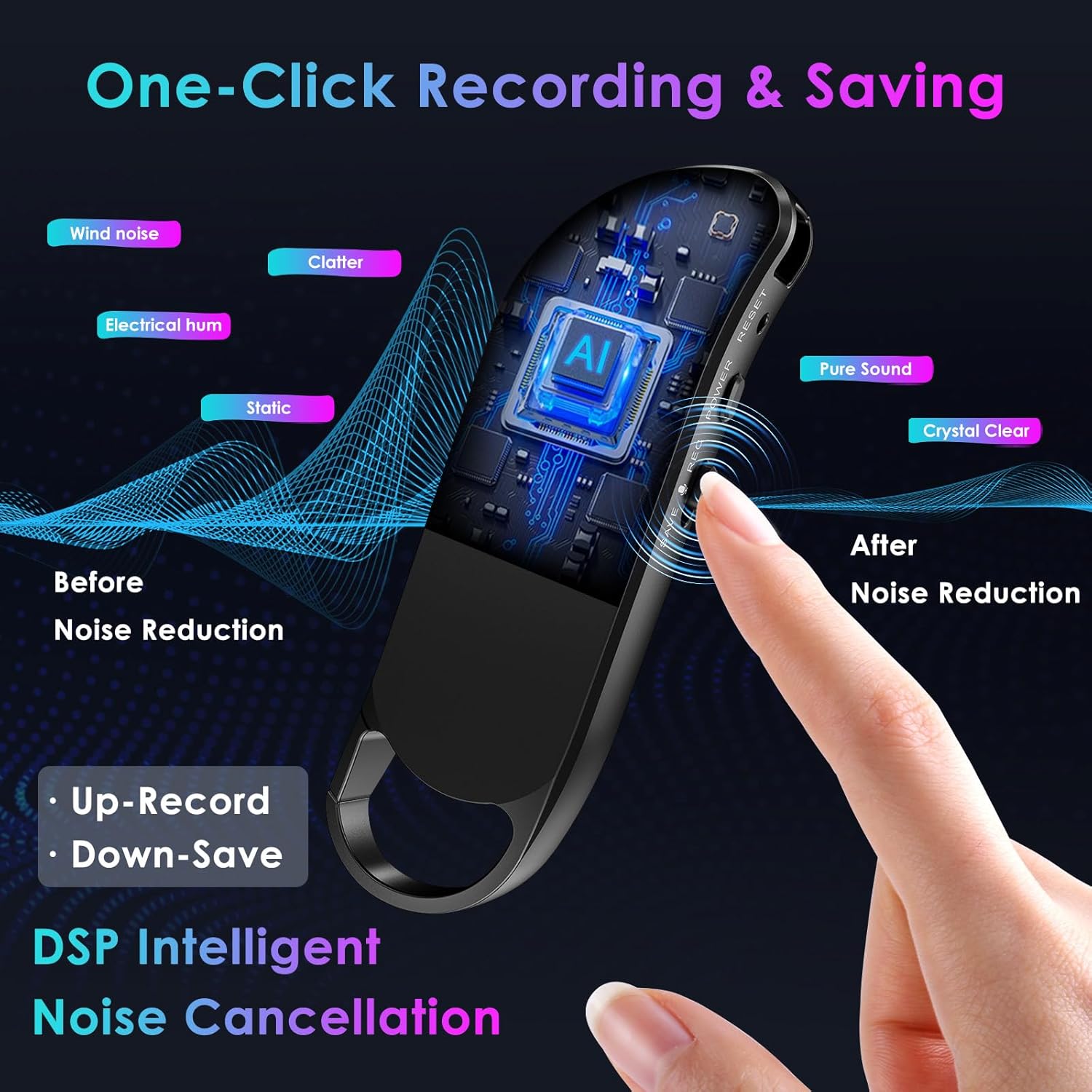 - AI Noise Cancellation: Our voice recorder's advanced AI chip intelligently identifies and eliminates over 95% of distracting sounds. It focuses purely on human speech, delivering stunningly clear sound. Whether you're in a lecture, a busy meeting, or a public interview, dual noise-cancelling mics ensure pure, high-fidelity voice capture