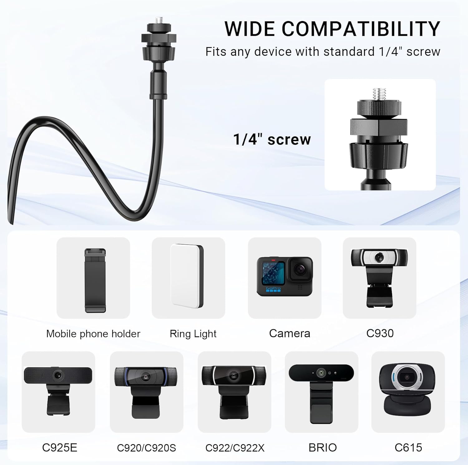 - 【1/4" Screw & Wide Compatibility】 Ready to use right out of the box. This stand compatible with popular webcams like Logitech Brio and C920 series, smartphones, GoPros, and even compact microphones like the Blue Yeti (using the included adapter). The standard 1/4" screw means it’s compatible with most devices you already own.