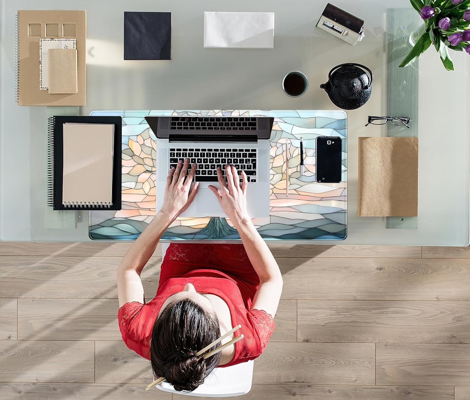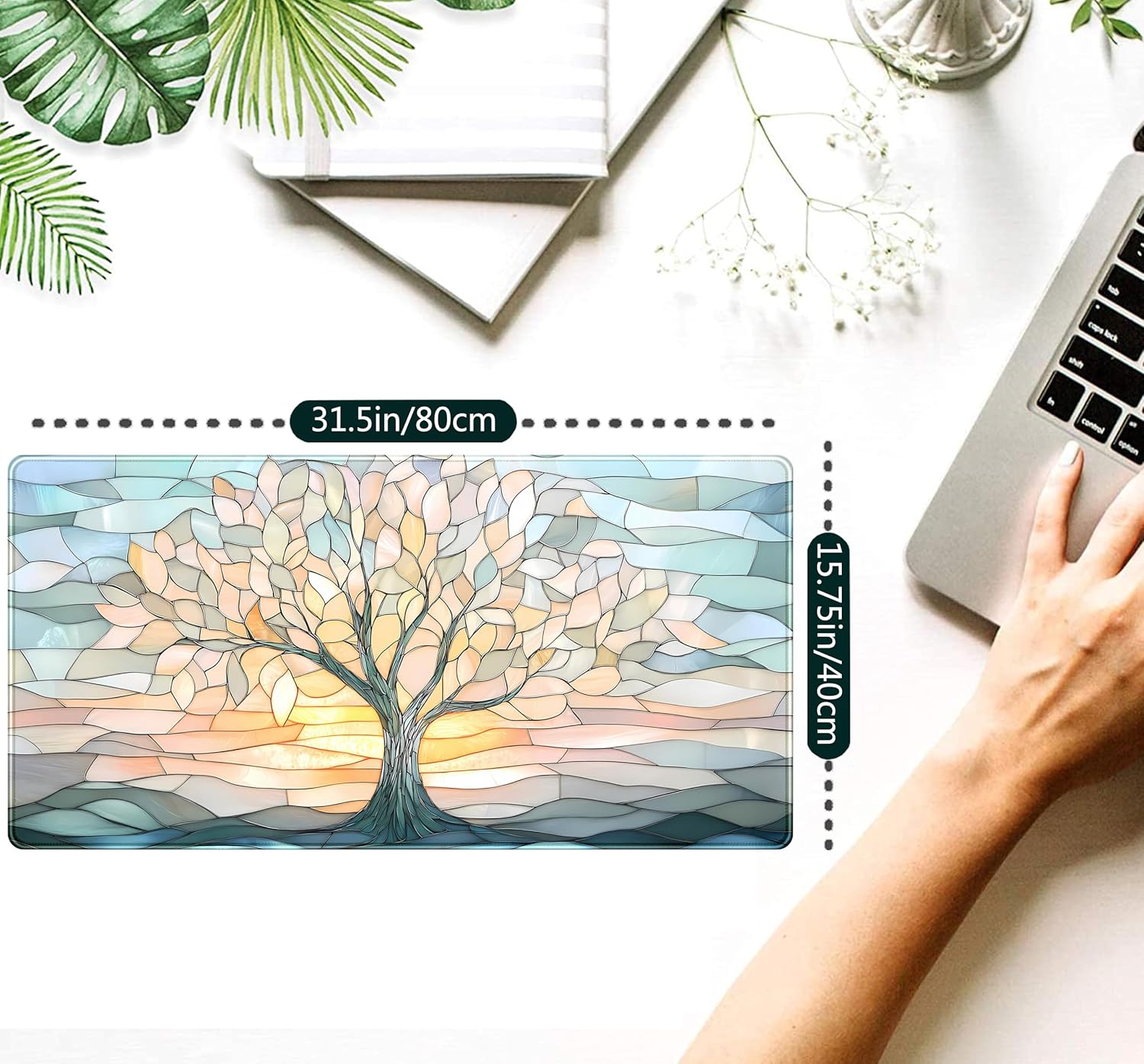 Desk Mat Cute Tree of Life Mouse Pad Gaming XXL Large Extended Desk Matt for Desktop, Faux Stained Glass Pastel Desk Pad, Laptop Computer Keyboard Mouse Mat, Office Decor Deskamt, 31.5x15.75 in