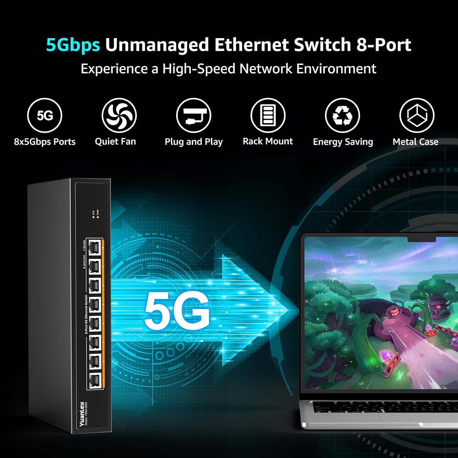 - ✅【8 Port 5Gbps Ethernet Switch】Equipped with 8 x 5Gbps RJ45 Ethernet ports for fast multi-gigabit connectivity. Each port supports auto-adaptive 5G/2.5G/1G/100Mbps, providing high bandwidth for NAS, servers, WiFi 6 APs, and more.