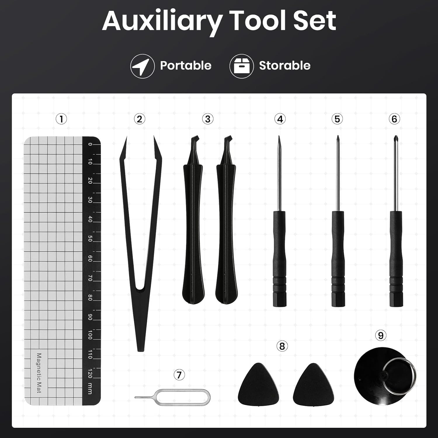 - 【38Pcs Precision Screwdriver Set】This screwdriver set includes 24 different bits (Phillips, flathead, hex, hex safety, pentalobe, hexagon, etc.), ensuring you have the smallest yet most complete repair toolkit. It comes with a screwdriver handle, double-ended pry bar, long pry bar, triangular pry bar, tweezers, cleaning brush, and a suction cup with a SIM card ejector pin. Total of 38 pieces.