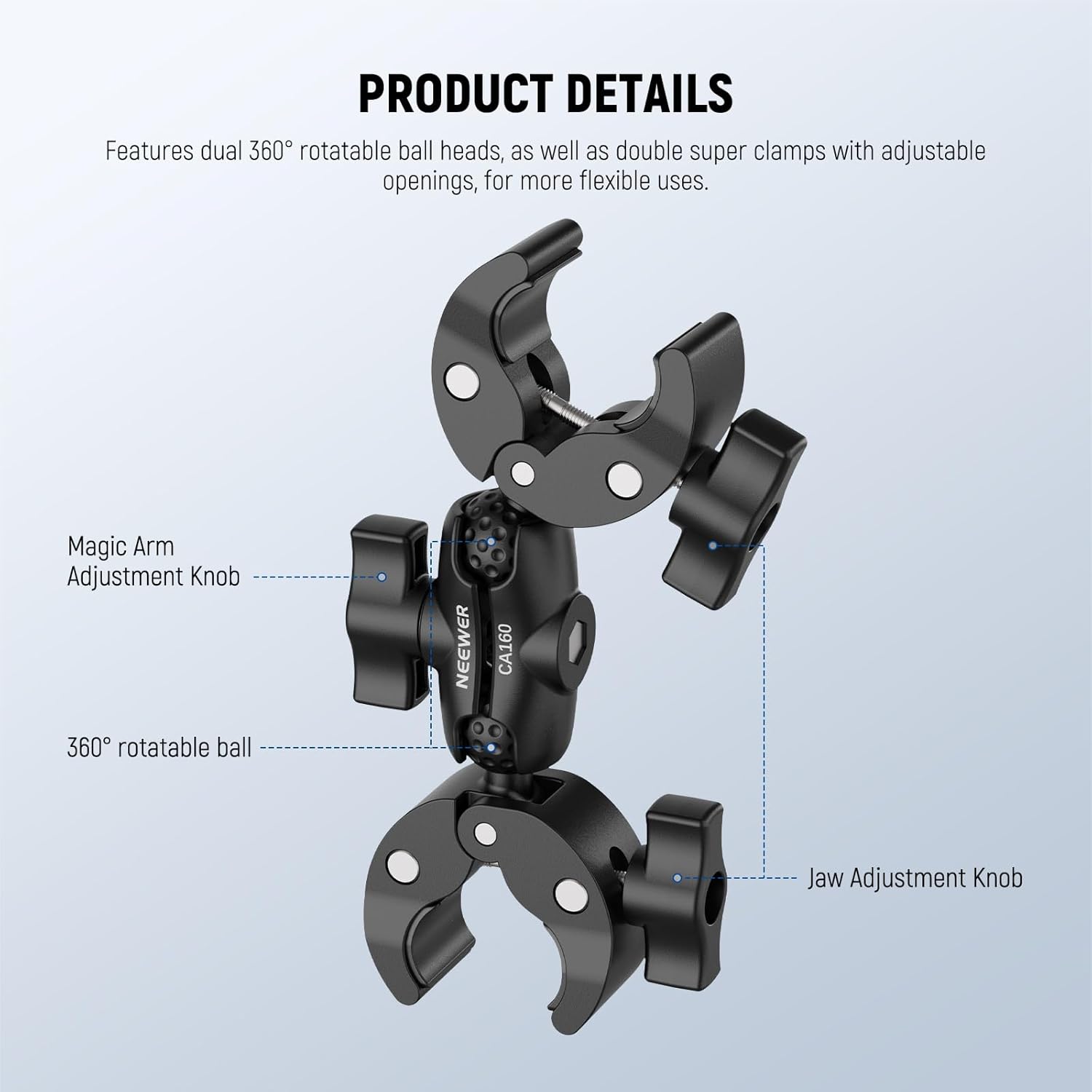- 【Magic Arm with Super Clamps】 The magic arm features a super clamp and a 360° ball head on each end, allowing you to securely hold your device while easily adjusting its position, making it particularly useful for situations where you need to quickly add or reposition gear during photo shoots or video recordings