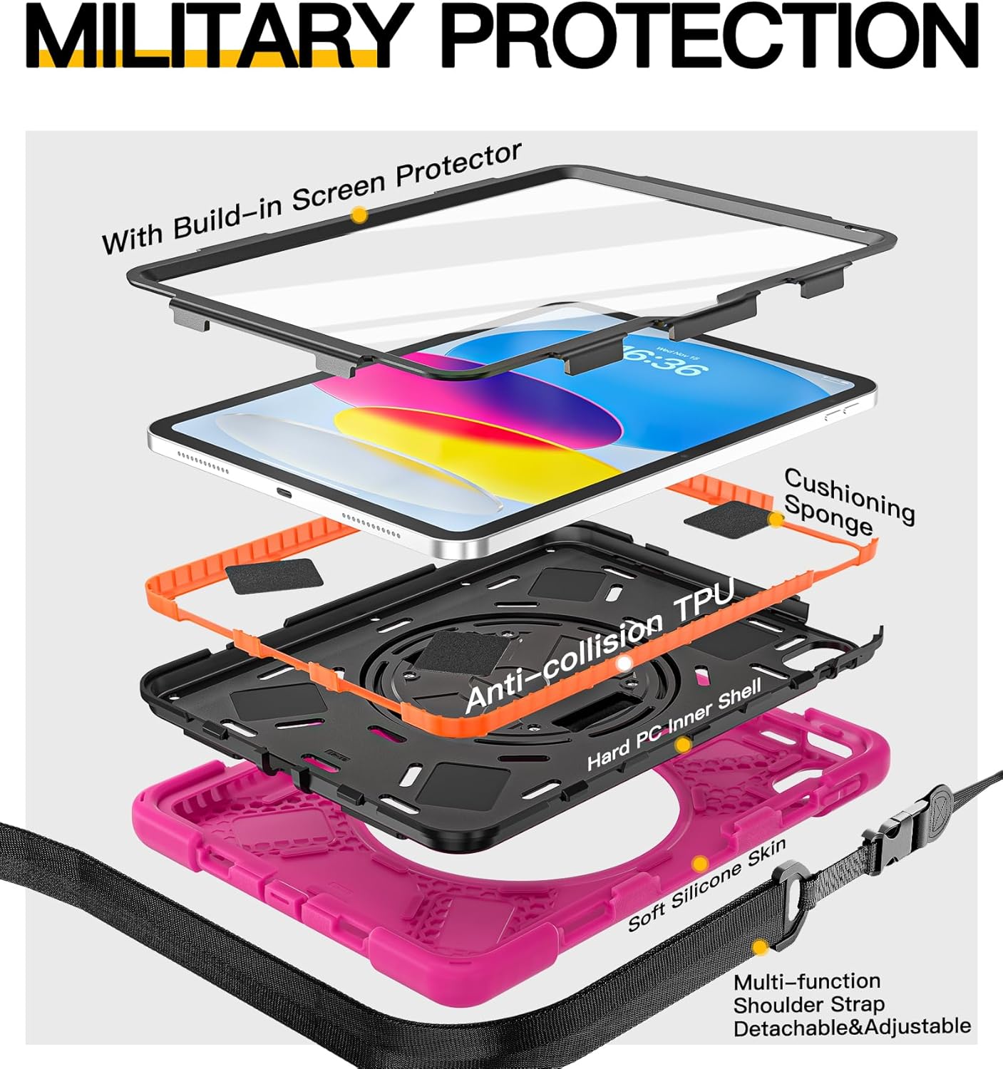 - [360°Rotating Handle/Stand & Shoulder Strap]:This ipad 11/10.9 inch case have a 360° rotation system that includes a kickstand and a hand strap, by rotating it, you can hold your ipad at any angle, by utilizing the swivel and the stand, you can support your ipad at multiple angles.The adjustable shoulder strap allows you to carry or hang your iPad at any time, so that you can provide more convenience in outdoor sports, traveling.