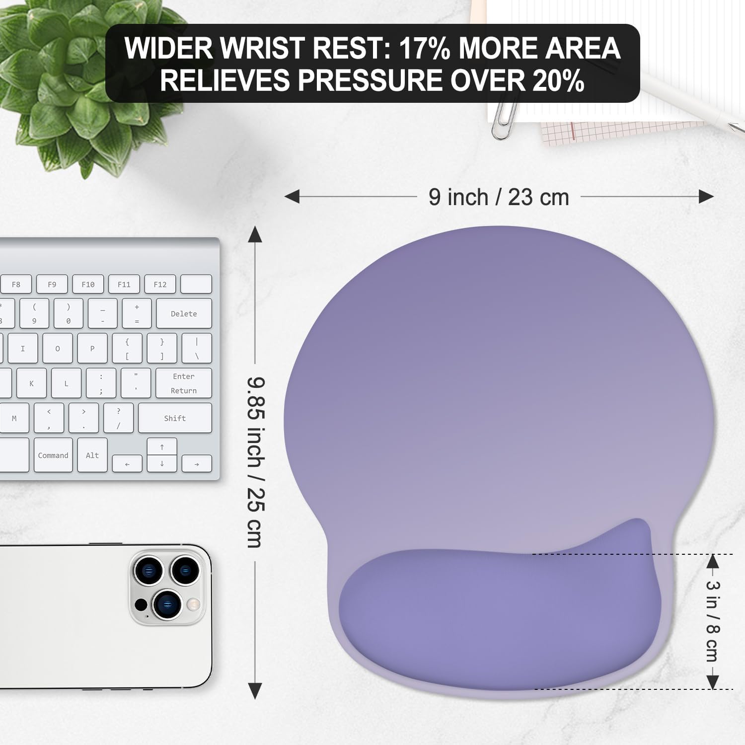 ITNRSIIET Ergonomic Mouse Pad with Wider Memory Foam Wrist Rest +17%, Curved Cushion Reduces Pressure 20%, Pain Relief, Non-Slip, Smooth, Cute Color Desk Accessory, 9.85 x 9 inch, Purple Gradient