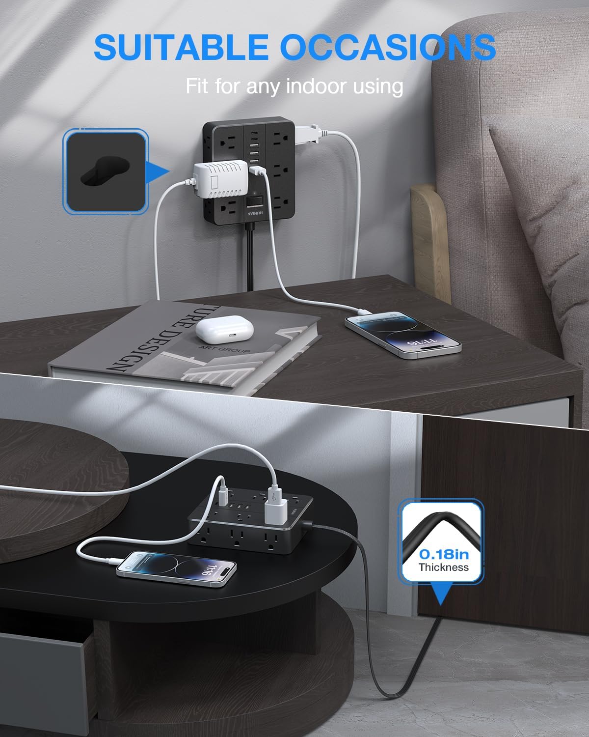 Flat Plug Surge Protector Power Strip, HUNIAN 12 Widely Spaced Outlets with 6 USB Charger (2 USB C Ports), 10 Ft Extension Cord Desk Charging Station for Home Office Supplies, Dorm Room, Black