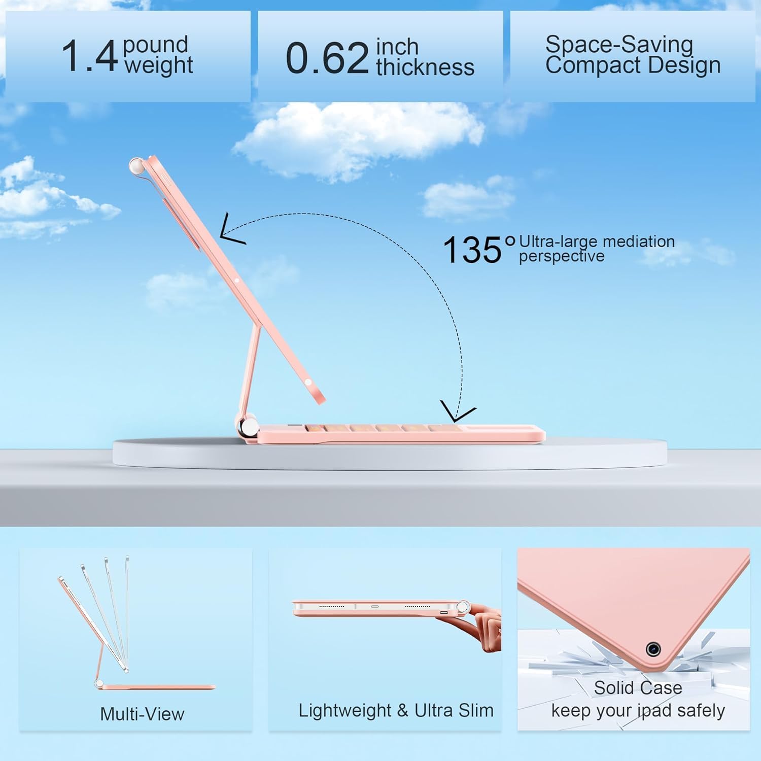 - Floating Cantilever Stand & Multi-View Flexibility: The magic-style floating cantilever stand and strong magnetic attraction hold iPad firmly and stably in place like a laptop, the floating cantilever design allows you to easily adjust to your favorite viewing angle for typing or browsing.